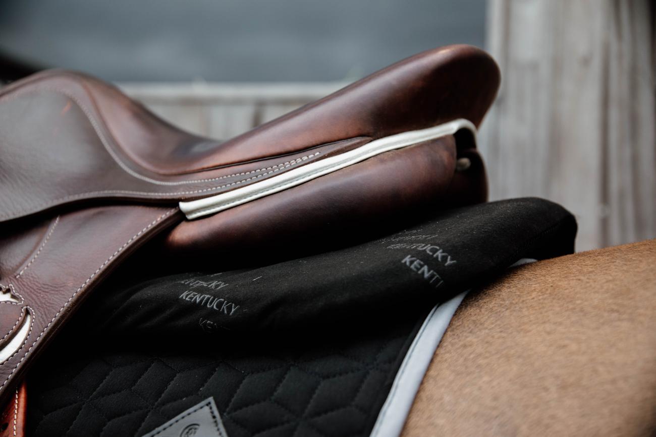 If you’re planning on buying a half pad, make sure the half pad is breathable. Otherwise the half pad will just heat up the back of the horse. Kentucky’s half pads are equipped with 3D spacer to ensure the best ventilation for your horse’s back. Also see if the half pad has some silicone grip to keep the saddle pad in place. Having a half pad that is constantly moving under your saddle or slipping away is not effective and very annoying. Our half pads are equipped with silicone printing to secure the position of the pad. If you want an extra fancy look, you can also use our sheepskin half pad. The sheepskin will also help the half pad sit in place. Last but not least, assure that the half pad has withers and spine relieving functions. Kentucky’s half pads have a special cut for the withers, which ensures less pressure on the withers and spine. For the best result with our half pads, we advise you to have your saddle checked by a saddle fitter.