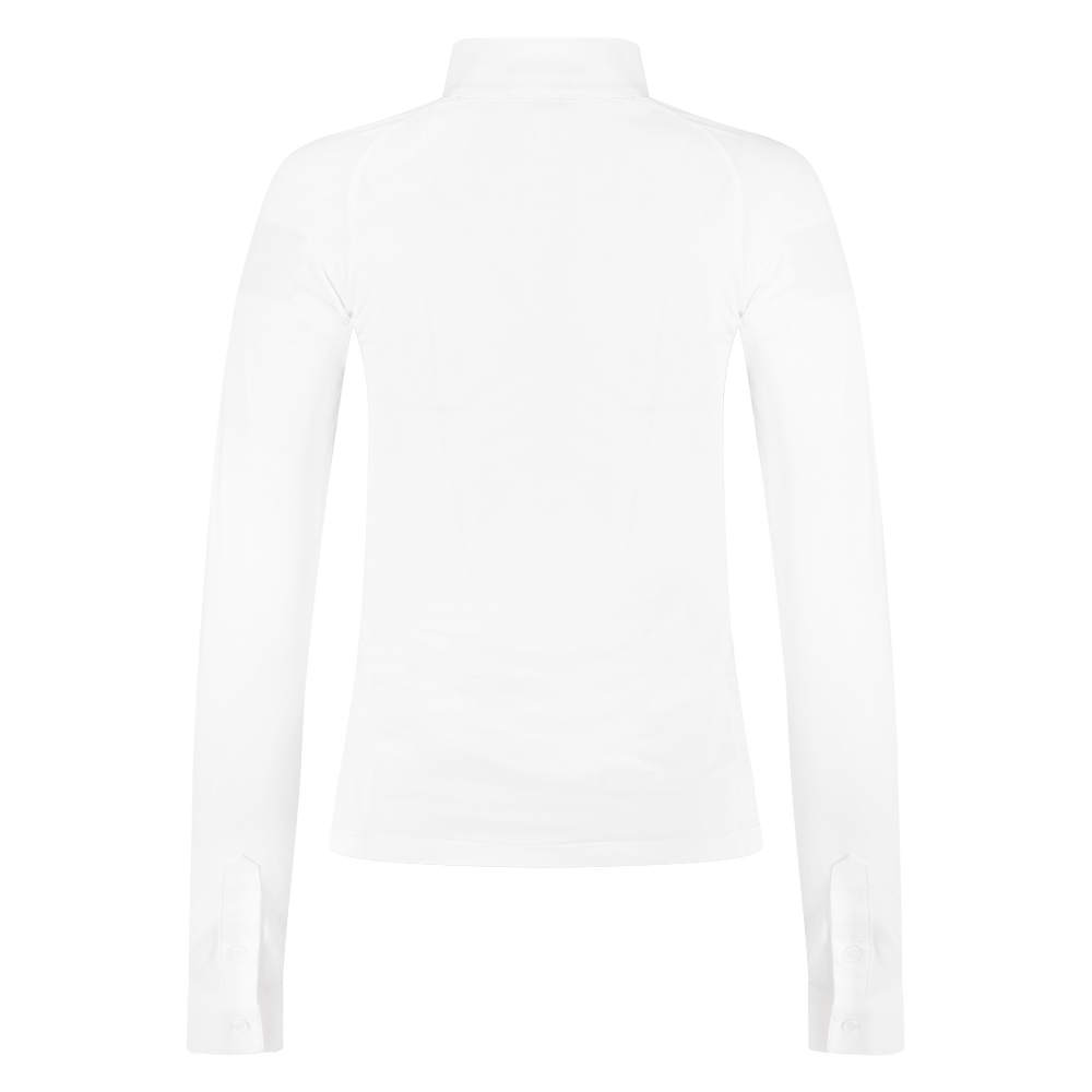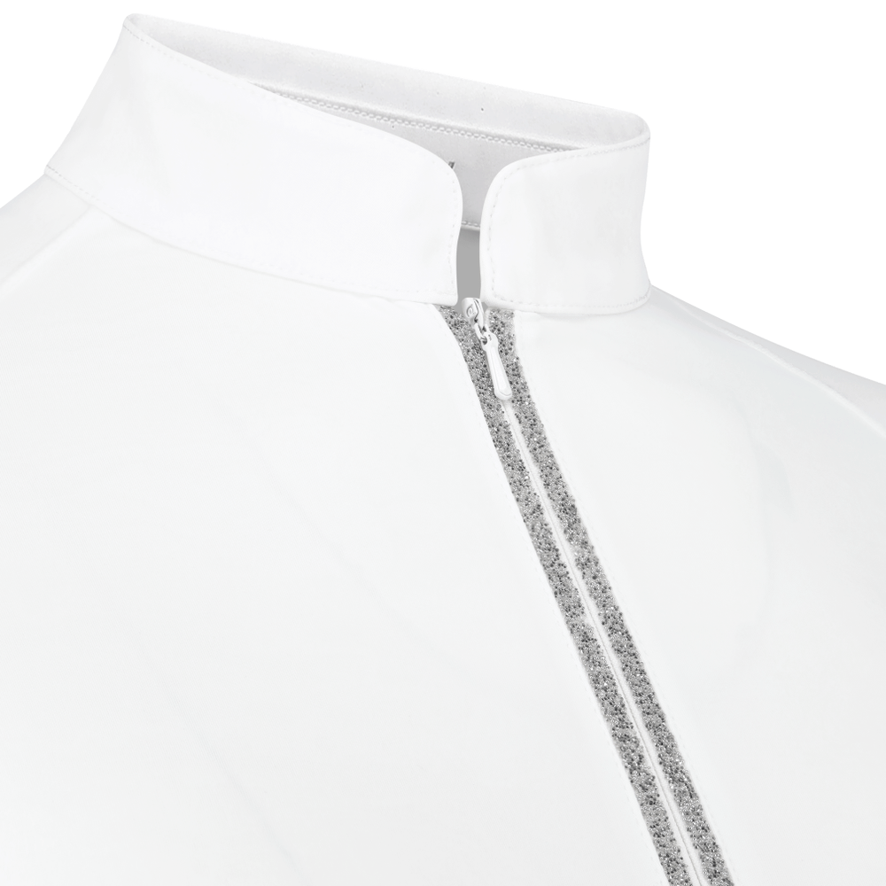 Das Classic Show Shirt mit Glitzerreißverschluss vereint klassische Reitsport-Eleganz mit einem feinen Funkeln. Für Reiterinnen, die zeitloses Design schätzen, bietet diese langärmelige Version zusätzliche Bedeckung – ohne Kompromisse bei Atmungsaktivität oder Bewegungsfreiheit. Der strahlend weiße Kragen mit zartem Glitzereffekt sorgt für den perfekten Hauch von Glamour, während der Reißverschluss vorne ein schnelles und stilvolles Anziehen ermöglicht. Egal ob bei sommerlicher Hitze oder im Rampenlicht – dieses Shirt lässt dich souverän aussehen und dich rundum wohlfühlen.
