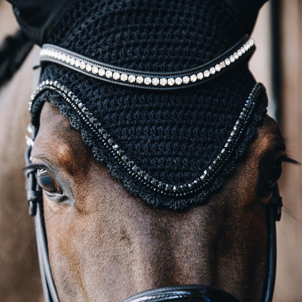 Unsere Fliegenhaube Long Stone & Pearl Soundless schützt die Ohren des Pferdes beim Reiten vor Fliegen und Geräuschen.