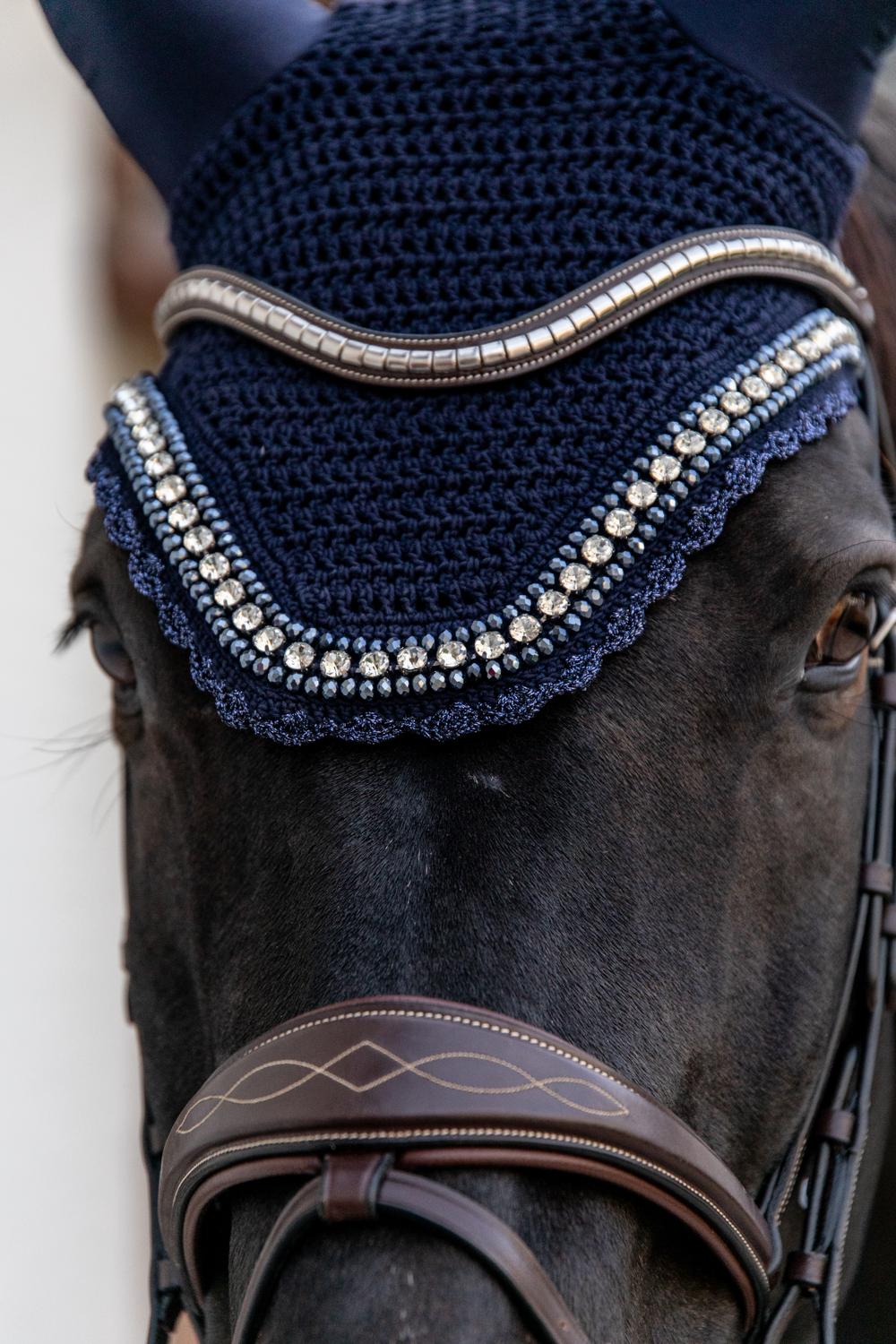 Der Fliegenhaube ist in der beliebten Wellington-Form geschnitten. Das Material der Ohren ist dehnbar und passt sich somit allen Pferden an. Wir haben ein verlängertes Halsteil eingearbeitet, damit die Fliegenhaube nicht unter die Trense rutscht.