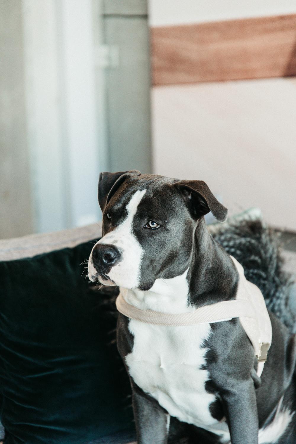 Das Geschirr ist sehr einfach anzulegen und kann über den Kopf gezogen werden. Es hat einen Klettverschluss in Brusthöhe sowie einen zweiten mit einer Schlaufe zum Schließen am Bauch. Mit dem Griff auf dem Rücken können Sie Ihren Hund bei Bedarf schnell greifen.