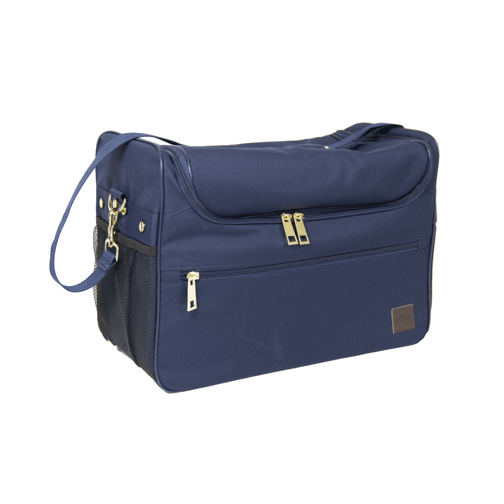 Das Innere ist dank starker Klettverschlüssen mit Laschen verstellbar. Daher können Sie die Tasche beliebig arrangieren. Im Hauptfach können Sie Ihre Bürsten, Sprühflaschen und andere Pflegeutensilien aufbewahren. Auf der Innenseite der Klappe befindet sich ein separates Fach für kleinere Gegenstände. Auf der Vorderseite befindet sich ein großes Fach für Gegenstände wie Mähnengummis, Nadeln und Fäden. Beide Seiten haben eine dehnbare Netztasche. Die Putztasche wird durch einen starken Reißverschluss verschlossen und hat einen abnehmbaren Riemen mit Schulterpolster für einfachen und bequemen Transport. Die Tasche an den Seiten verstärkt, um sie stabiler zu machen und die Bürsten zu schützen. Die Maße der Putztasche betragen 42,5 cm x 32,5 cm x 20 cm (L x H x B)