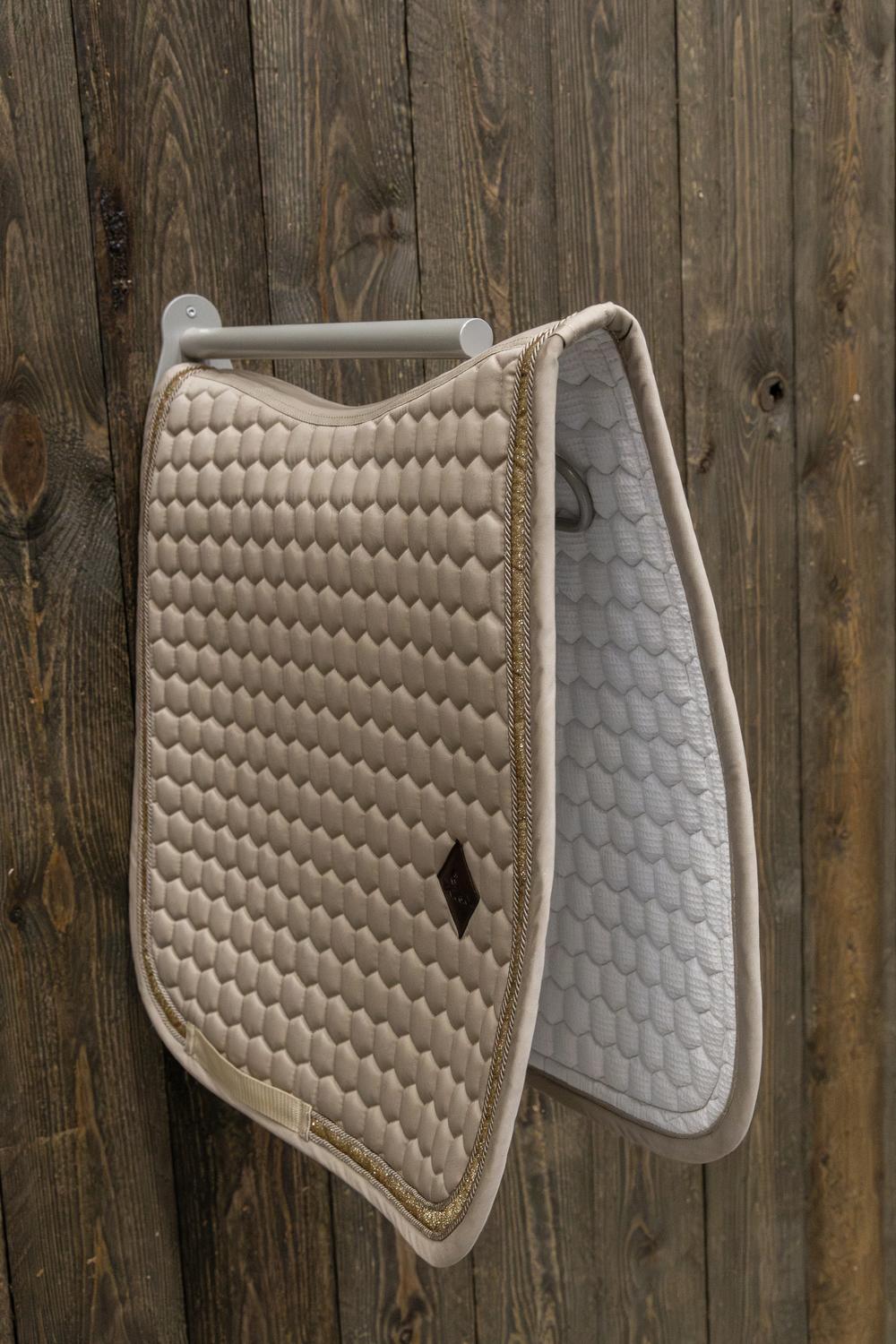 Der Sattelhalter ist rund, sodass er Ihren Sattel nicht beschädigen kann. Der Teil für den Sattel ist 44 cm lang und der Teil für die Schabracke ist 50 cm lang. Erhältlich in Schwarz, Silber und Gold.