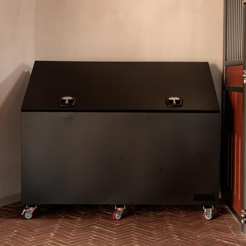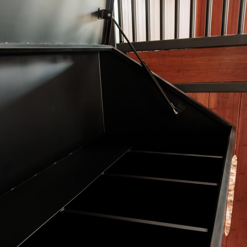 Mit fünf Fächern, jedes mit einer Kapazität von bis zu 20 kg Futter, kannst du verschiedene Futtersorten, Ergänzungsmittel oder Getreide ordentlich trennen. Der Deckel mit Gasdruckfedern öffnet sich mühelos und ermöglicht einen schnellen Zugriff, während das Futter frisch und geschützt bleibt. Zwei verschließbare Griffe sorgen für zusätzliche Sicherheit und halten das Futter deines Pferdes vor Schädlingen oder unbefugtem Zugriff geschützt.