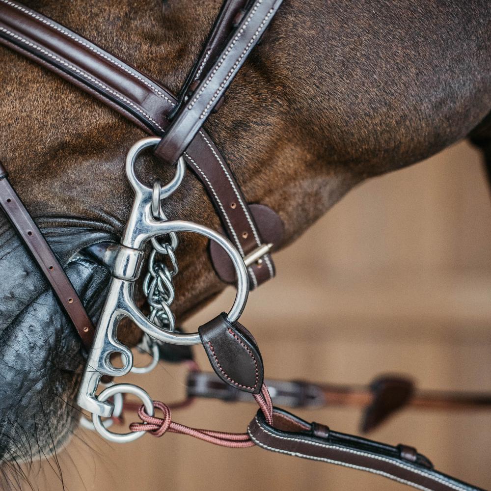Der lange Pelham Riemen verbindet das Pelham-Gebiss mit dem Zügel. Es ist ein leichter Riemen, der die Wirkung des Mundstücks auf das Pferdemaul mildert.
