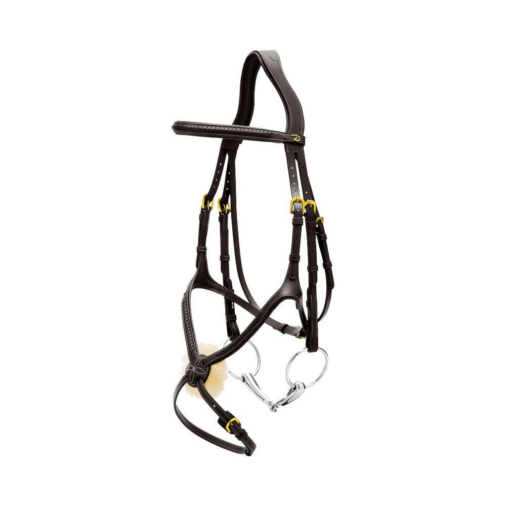 Die Trense ist Teil der D-Kollektion, was bedeutet, dass die Farbe der Nähte cremefarben ist. Die Schnallen sind aus Messing gefertigt. Es gibt geflochtene Lederdetails am Reithalfter und am Stirnband. Erhältlich in Braun und Schwarz.