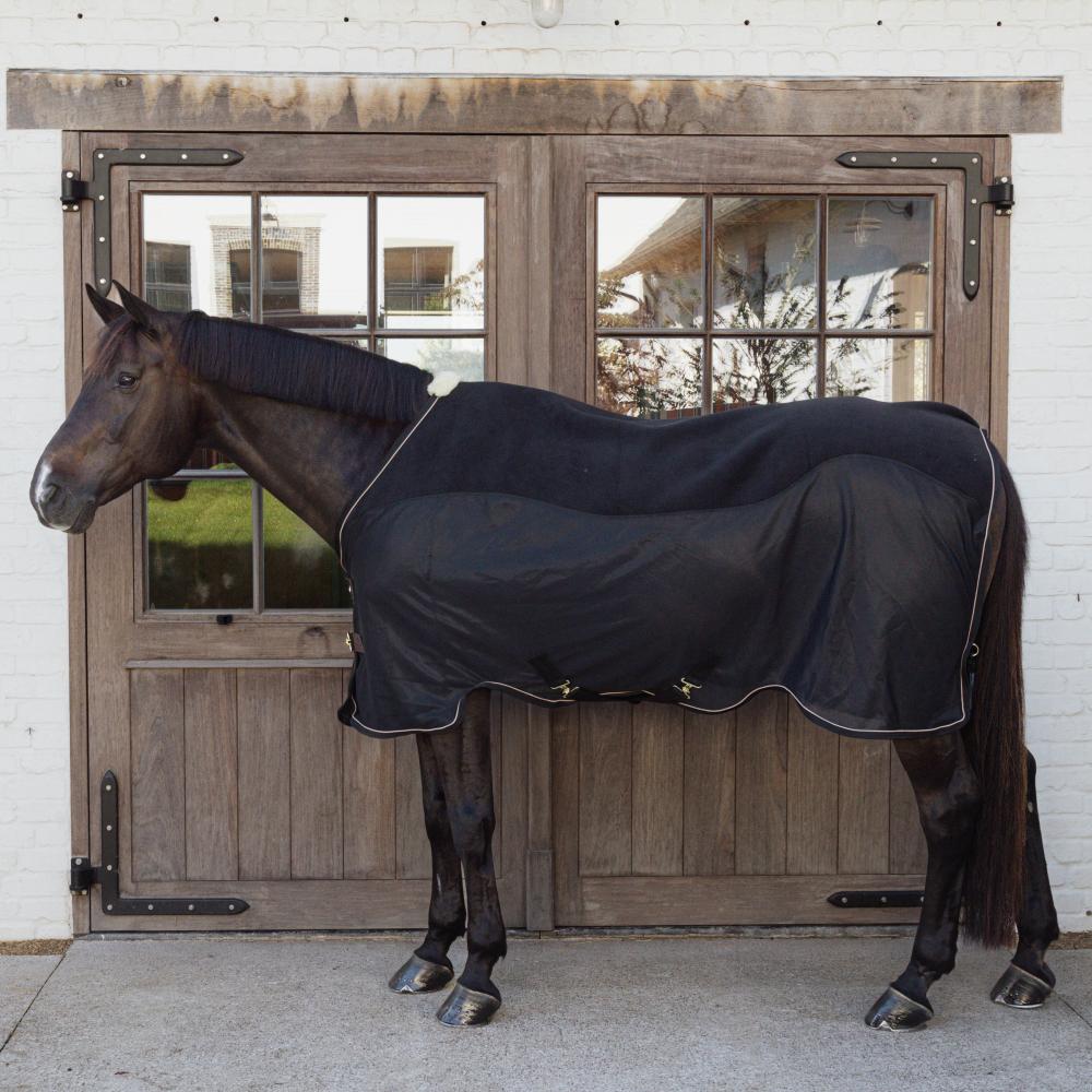 Die Decke ist eine Kombination aus Fliegendecke und Fleece. Der Rückenbereich besteht aus einem hochabsorbierenden Fleecestoff, der den Schweiß aufnimmt und das Pferd trocken hält.