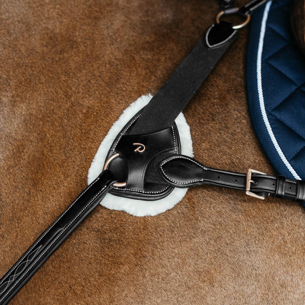 Das vegane Schafsfell Schutzpad ist leicht am 5-Punkt-Vorderzeug zu befestigen. Es kann täglich beim Training verwendet werden.