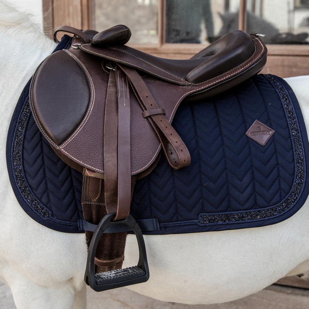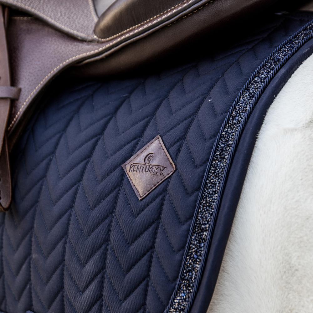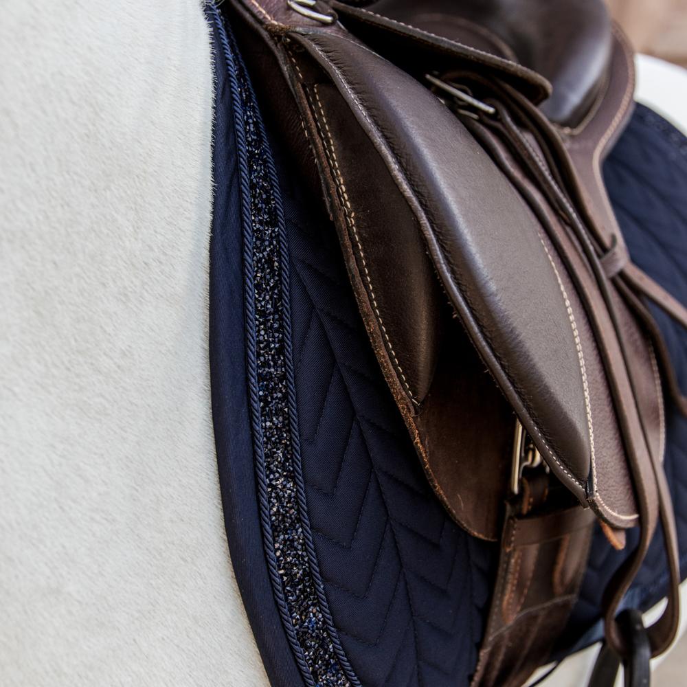 Fabrics & materials This saddle pad has a unique fishbone quilting and features a stunning Glitter stone binding.