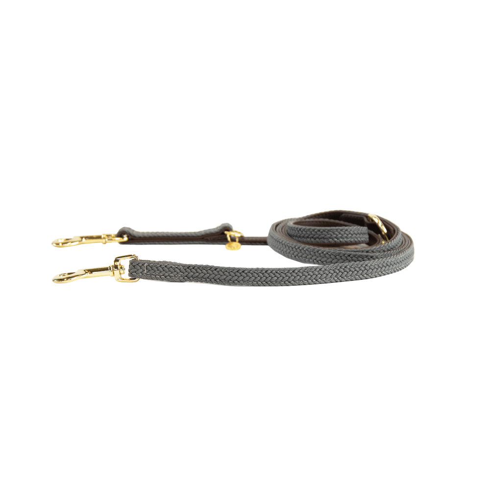 La boucle est dorée pour correspondre à tous nos colliers pour chien. La laisse permet d'être ajustée en trois longueurs différentes grâce à ses trois anneaux.