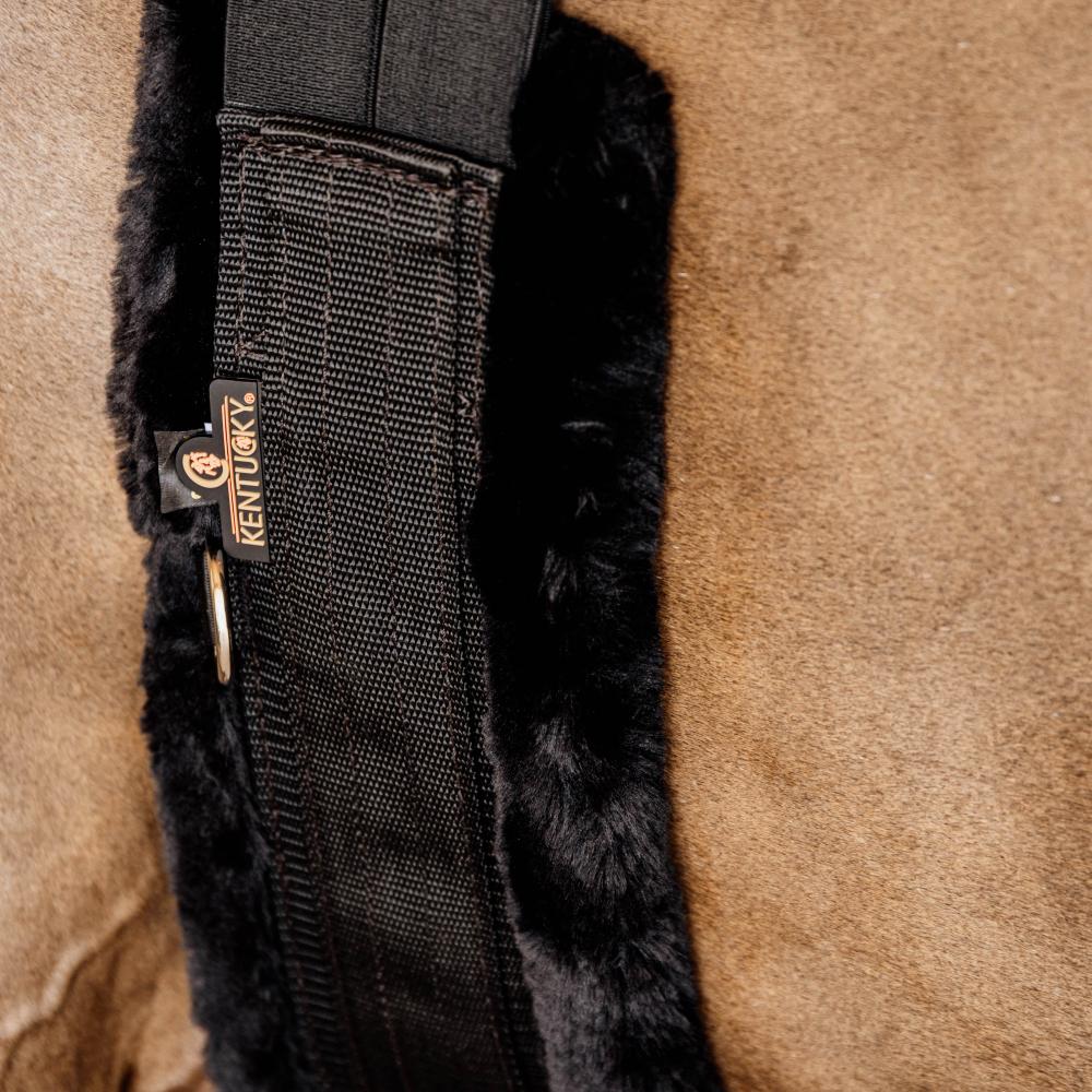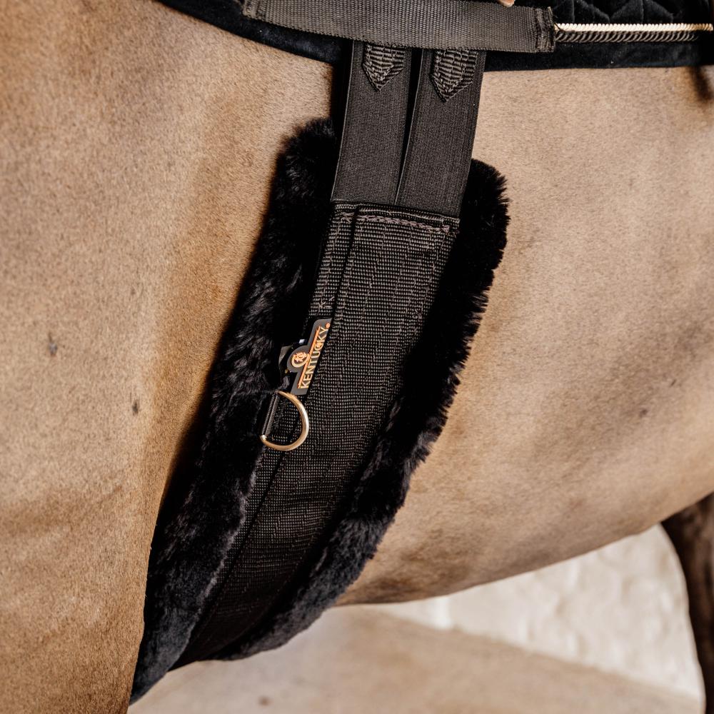 De singel Sheepskin Girth die gevoerd is met Nylon is een product dat vele kwaliteiten bezit! Flexibiliteit, zachtheid, weerstand, lichtheid, comfort zijn woorden die deze singel perfect omschrijven. De singel is aan beide zijden uitgerust met driedubbele elastiek om zo de druk gelijkmatig te verdelen, alsook heeft deze drie D-ringen om hulpteugels aan vast te maken. De driedubbele elastiek is zeer stevig en rekt niet uit. Net zoals onze andere singels met wol is deze 100% diervriendelijk aangezien we gebruik maken van artificiële wollen voering. De singel mag in de wasmachine gewassen worden op 30° wat het onderhoud zeer gemakkelijk maakt (geen droger). Dankzij al deze fantastische eigenschappen is deze singel uitermate geschikt voor het trainen van uw paard.