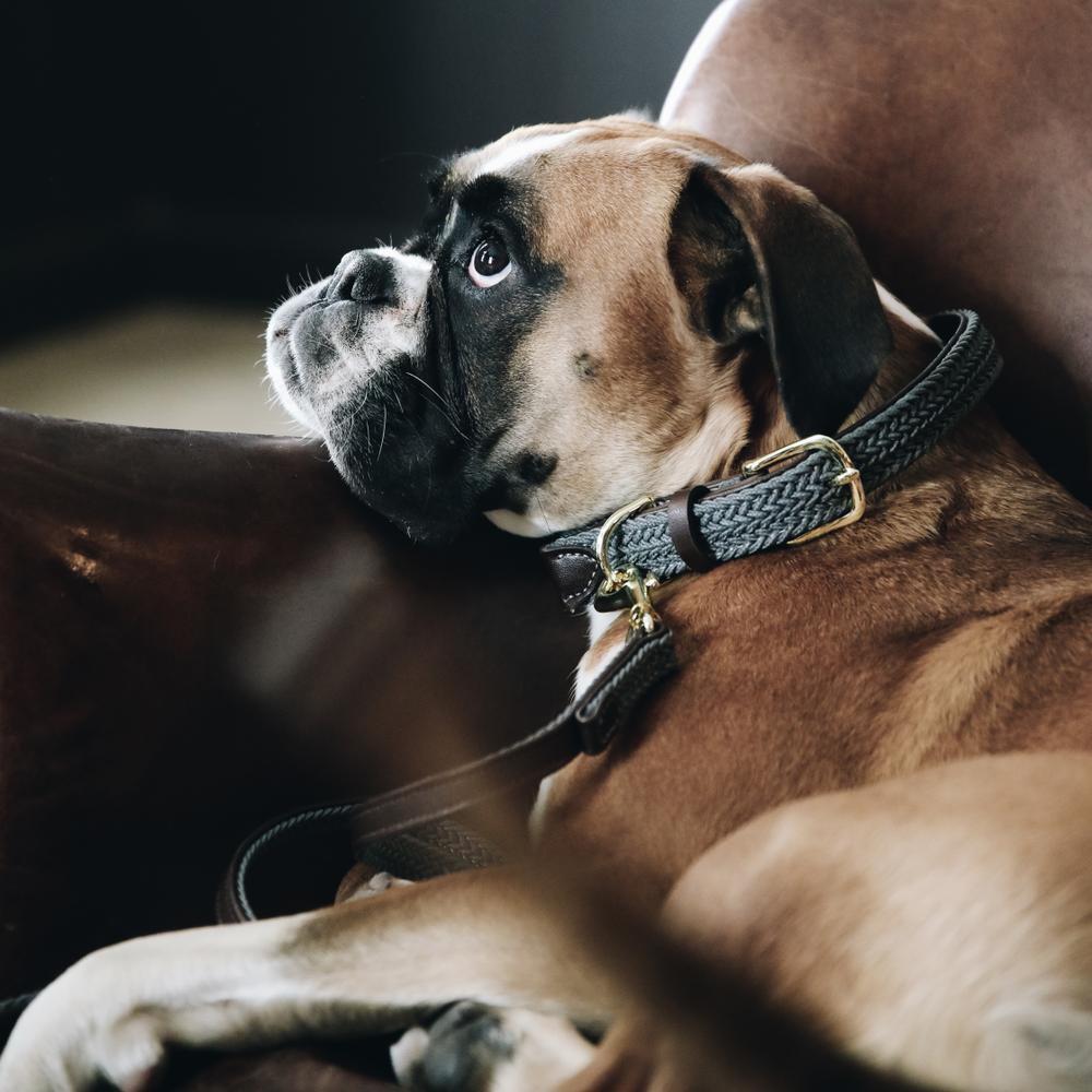 Deze hondenhalsband is gemaakt van artificieel leder (100% diervriendelijk) en heeft een nylon gevlochten design. De halsband heeft een goudkleurige ring waar je onze gelijkaardige gevlochten nylon hondenriem kan aan vastmaken! Het kleine bedeltje met Kentucky Dogwear logo kan worden gegraveerd op de andere zijde.