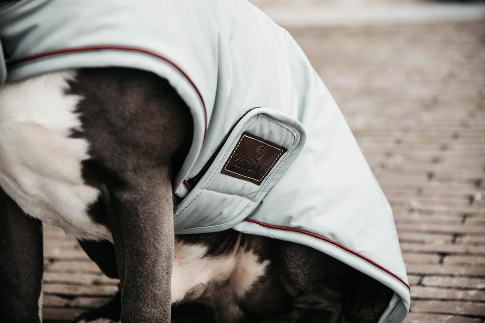 De hondenjas waterdicht heeft een buitenvoering van een duurzame 10 000mm (ISO standaard) waterdichte polyester, met een ademend membraan. Hierdoor kan je hond de hele dag in de regen lopen, zoder dat hij nat wordt. De bies en logo aan de zijkant zijn reflecterend, voor een nog betere bescherming als het donker is. Om je hond te beschermen tegen de kou heeft de jas 160g vulling en is de binnenkant gevoerd met artificiele konijnenvacht. Deze voering houdt de warme lucht van de hond vast en geeft dit terug af wanneer de hond het koud krijgt. Het zorgt ook voor een glanzende vacht. Er is een klein kapje van artificiele wol, deze kan worden omgevouwen voor meer bescherming. Onder de kap zit een artificieel lederen flap. Hieronder is een kleine opening voor de leiband voorzien.