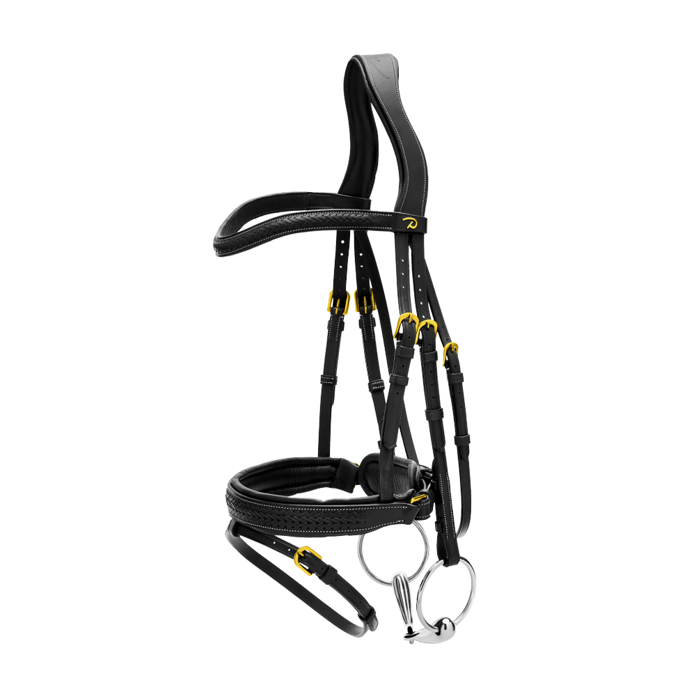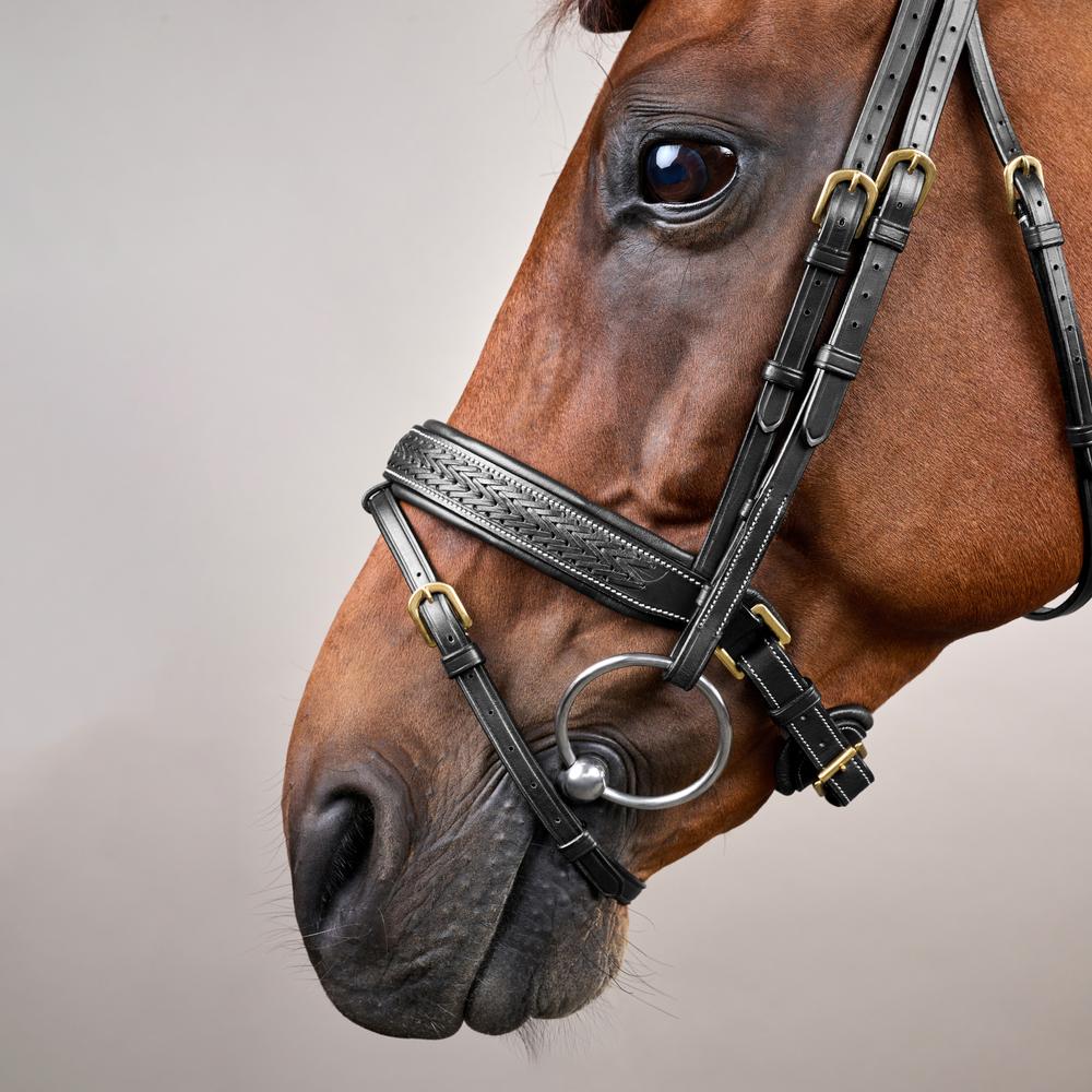 Het hoofdstel maakt deel uit van de Dy'on collectie, wat betekent dat het crèmekleurige stiksels en bronzen gespen heeft. Er zijn gewoven leren details op neusriem en frontriem. Verkrijgbaar in bruin en zwart.