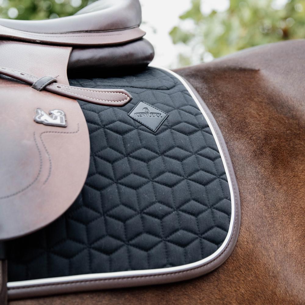 Dankzij de artificiële wol op de binnenzijde van de zadeldoek en ter hoogte van de schoft biedt deze vernieuwende zadeldoek niets dan comfort. Het artificieel lederen boortje zorgt ervoor dat de zadeldoek klasse uitstraalt. Ook het stijlvolle patroon zorgt voor een unieke look. Het subtiele logo in kunstleer staat op een centrale, iets hogere plaats zodat er plaats over is voor borduurwerk of uw eigen logo indien gewenst.