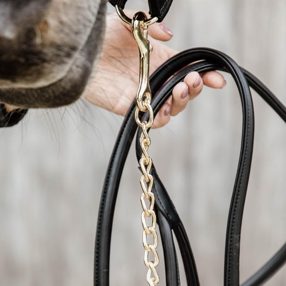 De lederen presentatielijn is ideaal om je paard mee te presenteren of om dagelijks te gebruiken omdat het materiaal zo handig is. De vergulde ketting kan gebruikt worden voor meer controle.