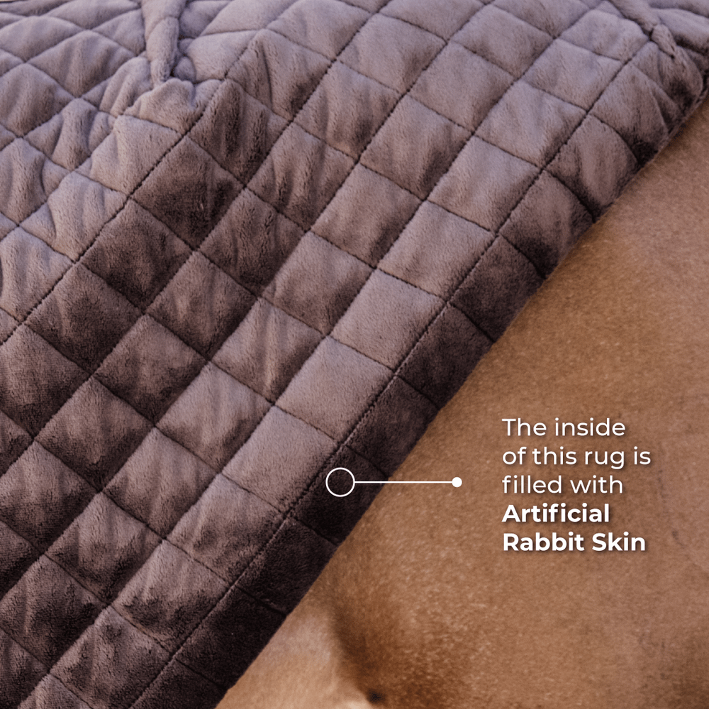 De buitenkant van het onderdeken is gemaakt van een polyester microvezel. Het garen in deze stof is opgeschuurd om een katoenachtig gevoel te geven. De voering van dit deken is gemaakt van onze populaire artificiële konijnenvacht. De artificiële konijnenvacht is enorm comfortabel voor je paard, vooral als hij net geschoren is of een gevoelige huid heeft. De voering creëert bovendien een extra isolerende laag die zorgt voor een glanzend effect van de paardenvacht. Voor de vulling gebruikten we 300g fiber fil vulling. Dit heeft dezelfde voordelen als dons maar, neemt in tegenstelling tot dons, geen geuren op.