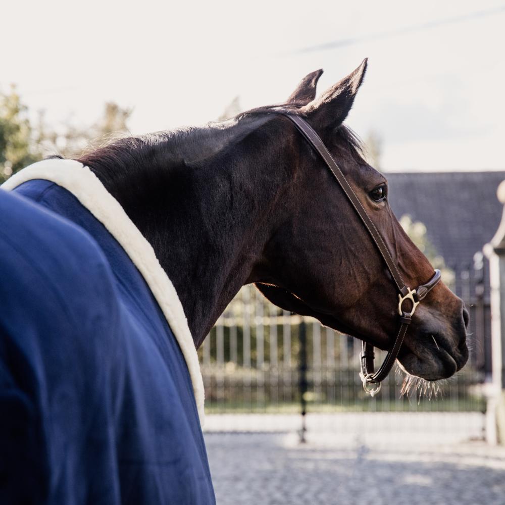Het deken is sterk absorberend en voert zweet of water snel af. De volledige hals en borst zijn bedekt met vegan schapenvacht, dat niet alleen warmte geeft maar ook extra comfort. Het deken is afgewerkt met veganistische leren biezen en elegante sluitingen aan de voorkant.