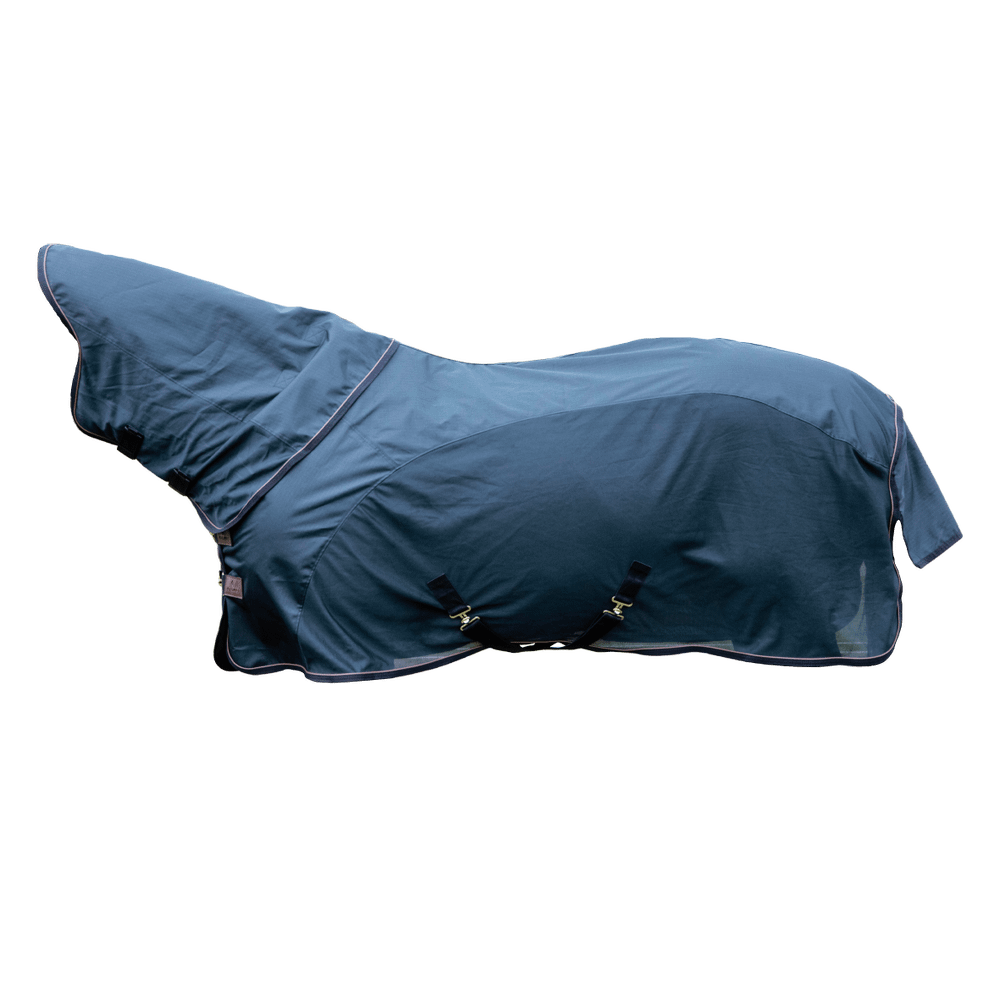 Het waterdichte vliegendeken is anatomisch gevormd en sluit met 2 voorsluitingen en 2 buiksingels in de kenmerkende Kentucky-stijl. Bij het deken zit een afneembare hals is die wordt gesloten door 2 sterke klittenband sluitingen. De klittenbandsluitingen om de hals aan het deken te bevestigen zitten aan de binnenkant van de hals. Zo voorkom je dat er water in het deken sijpelt.