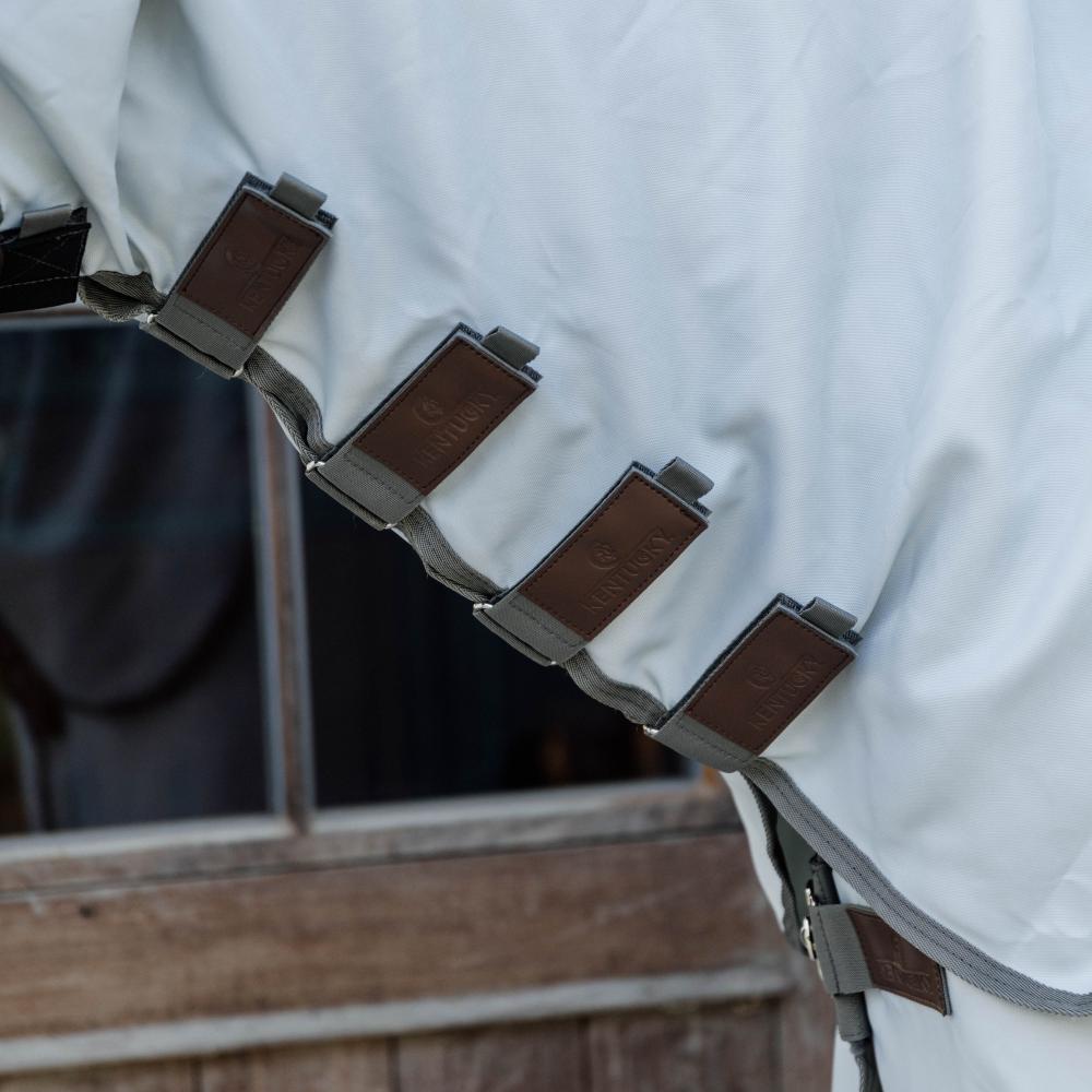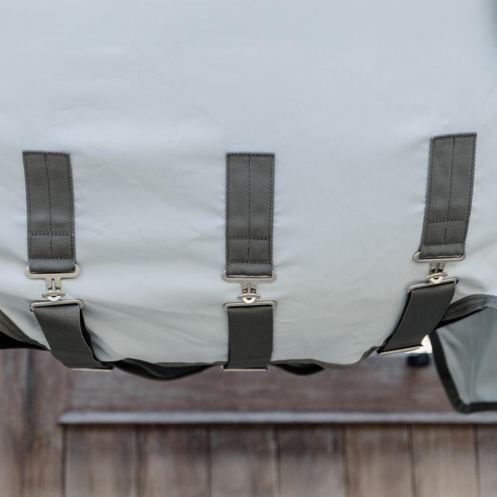 Om de buik te beschermen heeft de deken een buikflap. Deze flap wordt gesloten met 3 rechte surcingles. De staartflap is iets langer dan normaal en heeft een elastiek voor de staart.