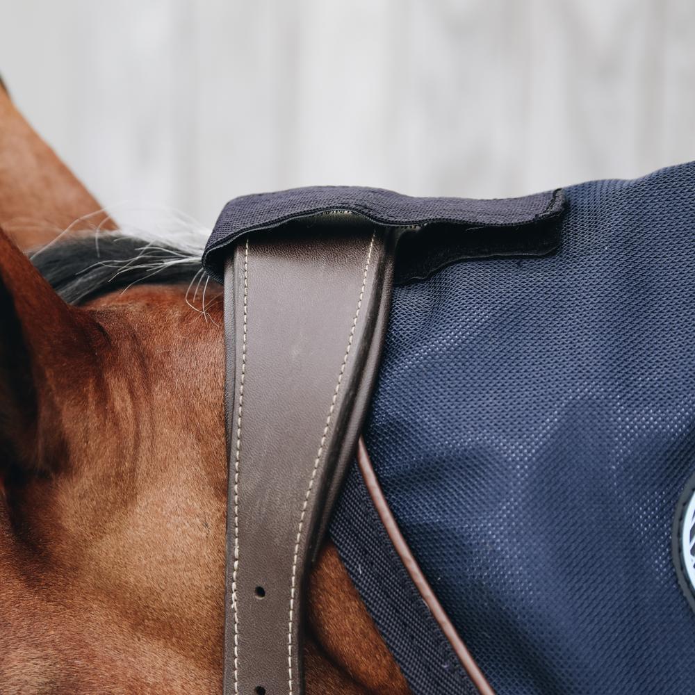 Opvolgend aan de ontwikkeling van ons Recuptex deken hebben we ook een nekstuk ontworpen dat perfect past bij dit deken. Gebaseerd op de Bekaert BEKINOX® technologie, deze bevatten het fijnste garen in inox (vezel in roestvrij staal) dat mee in de stof verweven zit. Het creëert zo een kooi van Faraday welke het magnetisch veld in het paardenlichaam reflecteert. Door het behoud van deze velden wordt de bloedcirculatie en het zuurstoftransport gestimuleerd en verbetert zo het herstel- en genezingsproces in een natuurlijk, beschermende omgeving. Het nekstuk is gemaakt uit een zeer stevige geweven stof die zowel in de zomer als in de winter gebruikt kan worden in combinatie met andere dekens. Dit nekstuk is ideaal te gebruiken voor of na het rijden om zo te helpen bij een betere spierontspanning, maar kan ’s nachts ook op blijven liggen. We raden wel aan van het deken geleidelijk te introduceren omwille van het soms tintelende effect. Dus best beginnen de eerste dagen met een uur en zo over de komende dagen het neck langer op te laten. Machine wasbaar op 30°, geen droger.