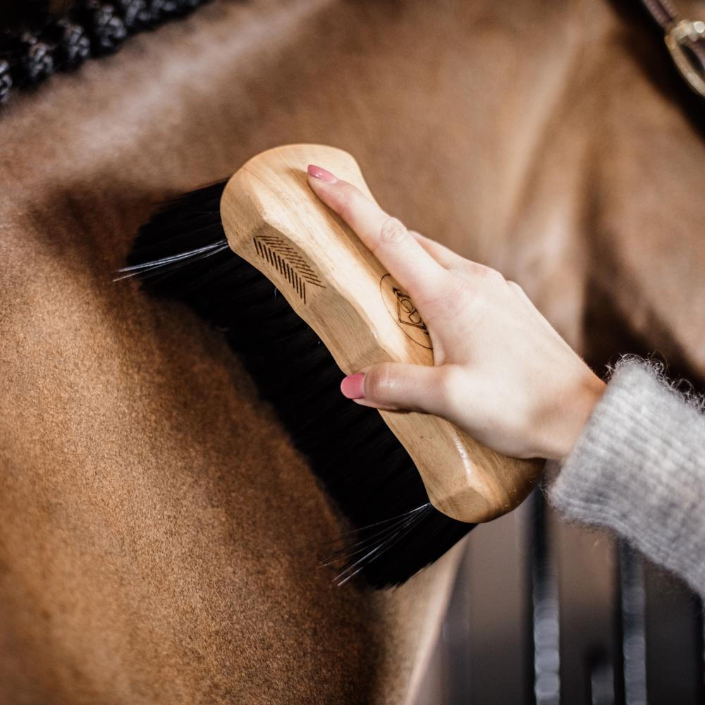 Deze gelakte borstel bestaat uit lange bruine haren en zorgt ervoor dat vuil en loshangende haren verwijderd worden. De polypropyleenharen zijn hard en ideaal om te gebruiken in de winter wanneer de vacht dikker is, of op een modderig paard. De bruine haren in het midden zijn ook gladder, dit zorgt voor een betere werking van de borstel. Maak uw borstel schoon door hem te dempen in warm water met zeep en zorg ervoor dat hij lang meegaat. Jouw paarden worden de ster van de stal dankzij deze borstel!