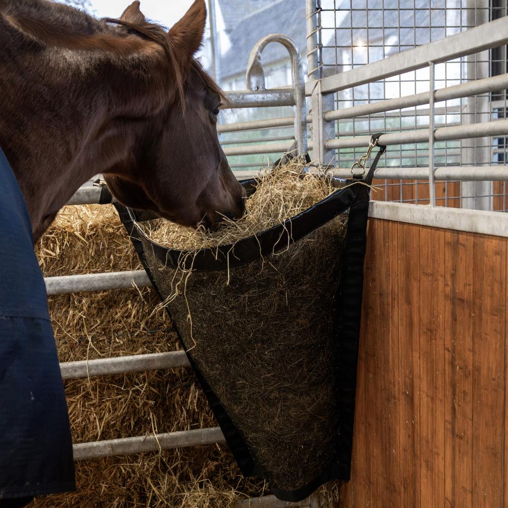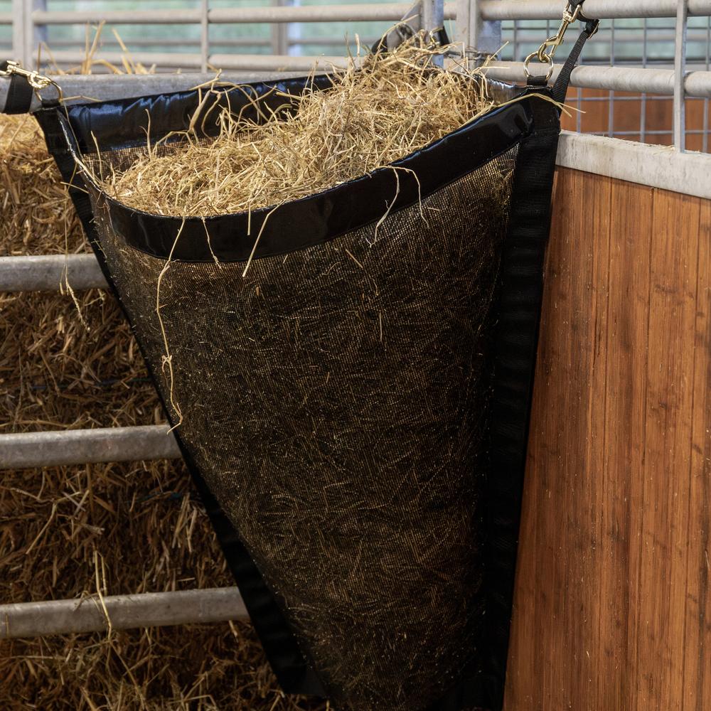 De hooizaak is gemaakt van een sterk materiaal en ontworpen om te voorkomen dat paarden met een hoef of schoen vast komen te zitten dankzij het fijn geweven net.