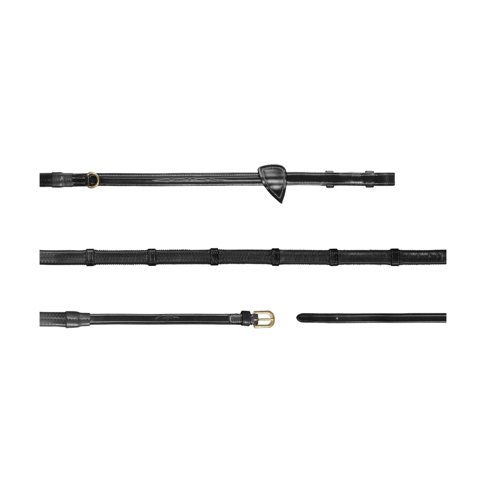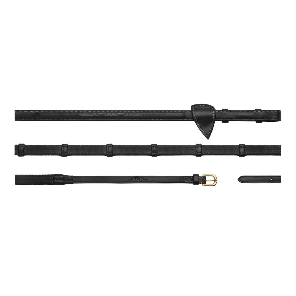Howlett Teugels 1/2 met 7 leren passanten en decoratief stiksel en een enkele D-ring aan het begin van de teugel om in combinatie met een schuifringmartingaal bevestiging te gebruiken.