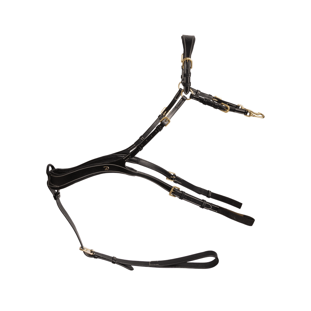Verstelbare bridge 5 bevestigingspunten Gebogen voor volledig vrije schouderbewegingen 6 cm lange elastic banden voor comfort Karabijnhaken voor bevestiging aan het zadel