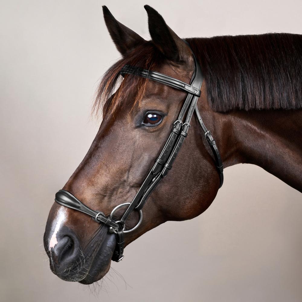 Uitgerust met roestvrijstalen gespen, combineert het Verstelbare Hoofdstel met Lage Neusriem functionaliteit met een gepolijste uitstraling. De roestvrijstalen hardware is bestand tegen roest en slijtage, waardoor het hoofdstel zijn strakke uiterlijk behoudt. Deze robuuste fittings dragen bij aan de algehele duurzaamheid van het hoofdstel, waardoor het een betrouwbare keuze is voor ruiters die stijl en functionaliteit in hun tuig eisen.