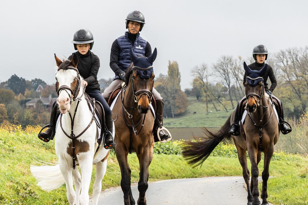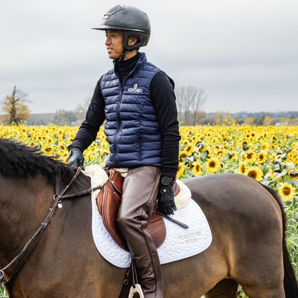 Voor frisse ochtenden en gerichte trainingssessies selecteerde Taizo Sugitani deze Herfst/Winter trainingsoutfit voor heren—strak, functioneel en gemaakt voor prestaties. Hij draagt de rijbroek onder de Long Chaps voor een extra, praktische laag en combineert dit met de Short Boots Front Zipper onder de chaps voor een stevige, nette pasvorm. De Long Chaps (bruin) zijn ideaal voor natte, koude dagen en helpen je benen warm en beschermd te houden. De Bodywarmer (navy) voegt lichte warmte toe zonder volume en de Riding Gloves Grip (zwart) zorgen voor een stabiele, zekere teugelvoering.