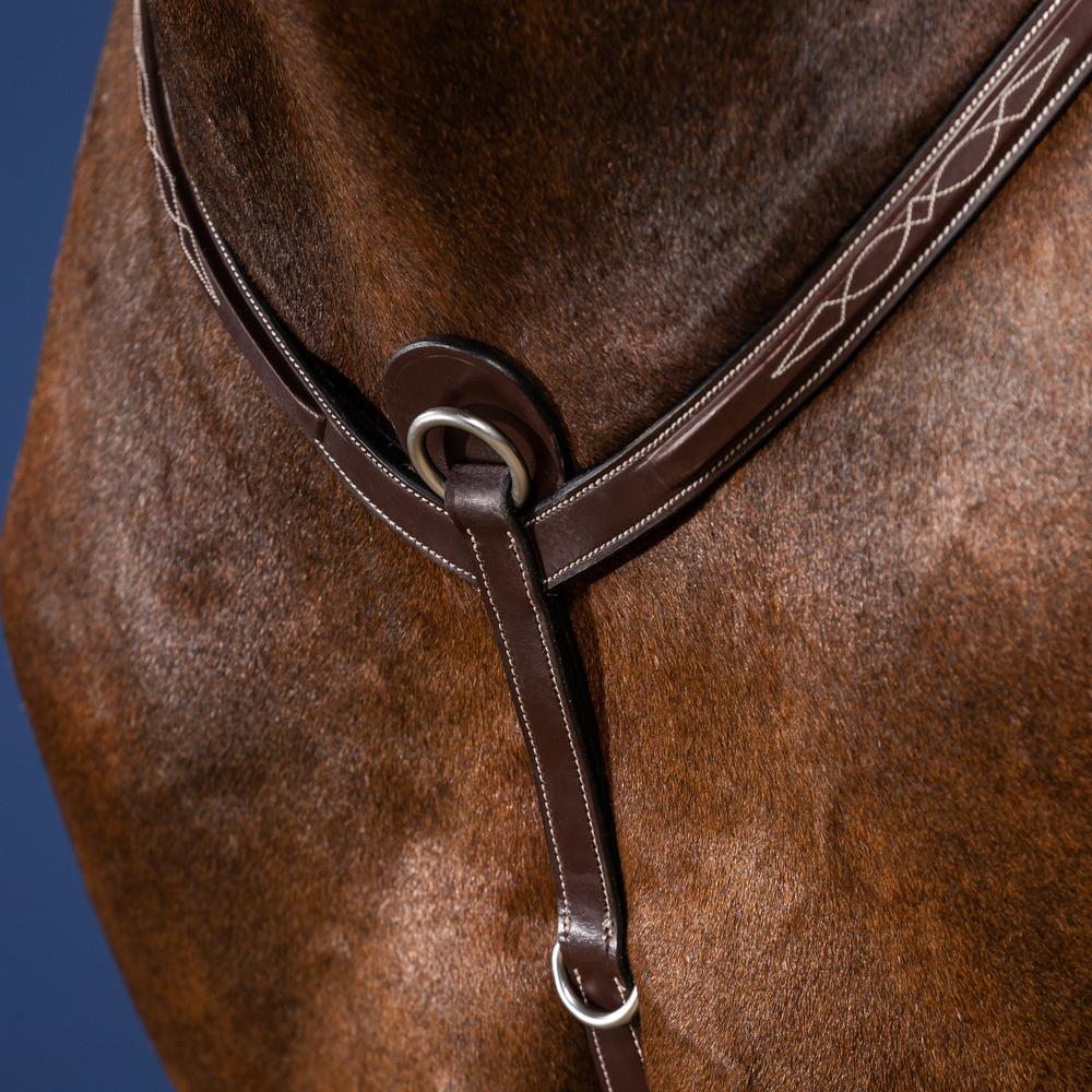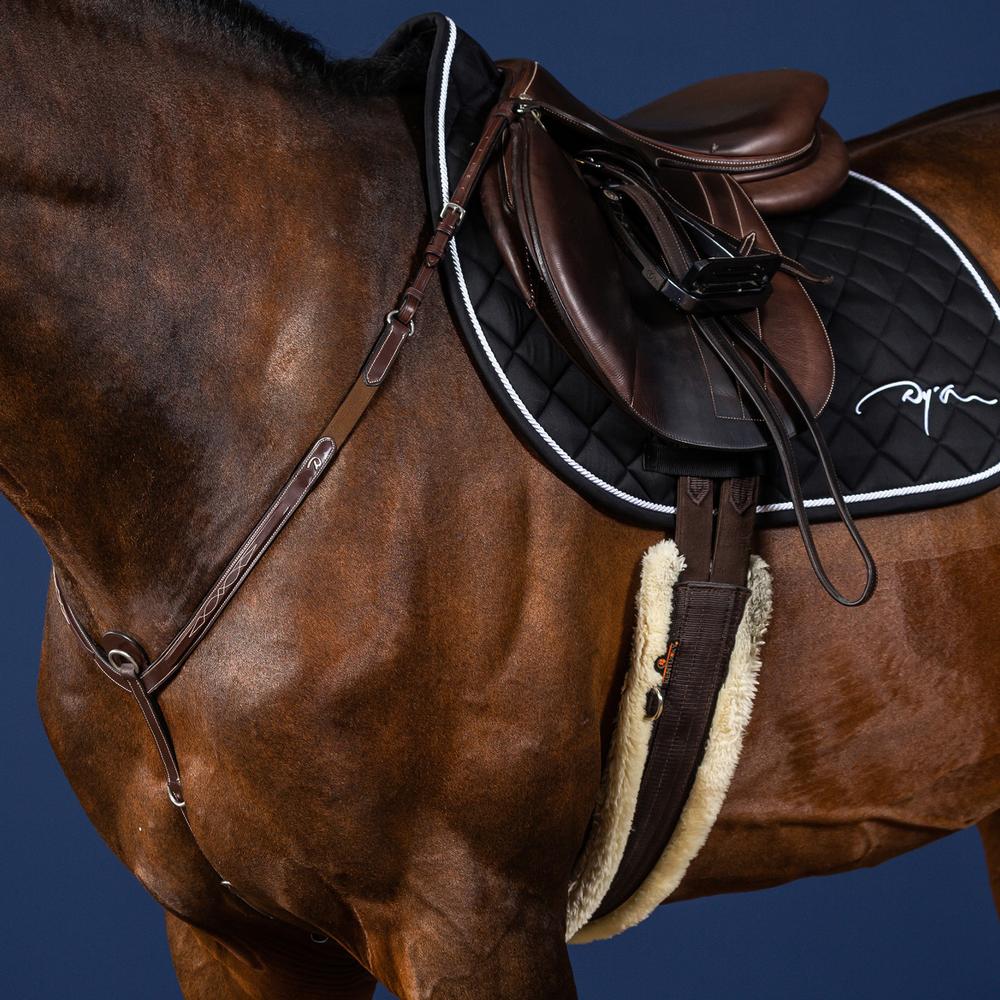 Borsttuig in licht verhoogd vierkant leer met decoratief stiksel Twee extra D-ringen voor longeertuig 6 cm lange elastic banden voor comfort Karabijnhaken voor bevestiging aan het zadel