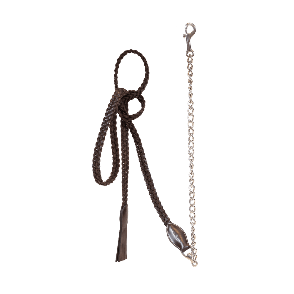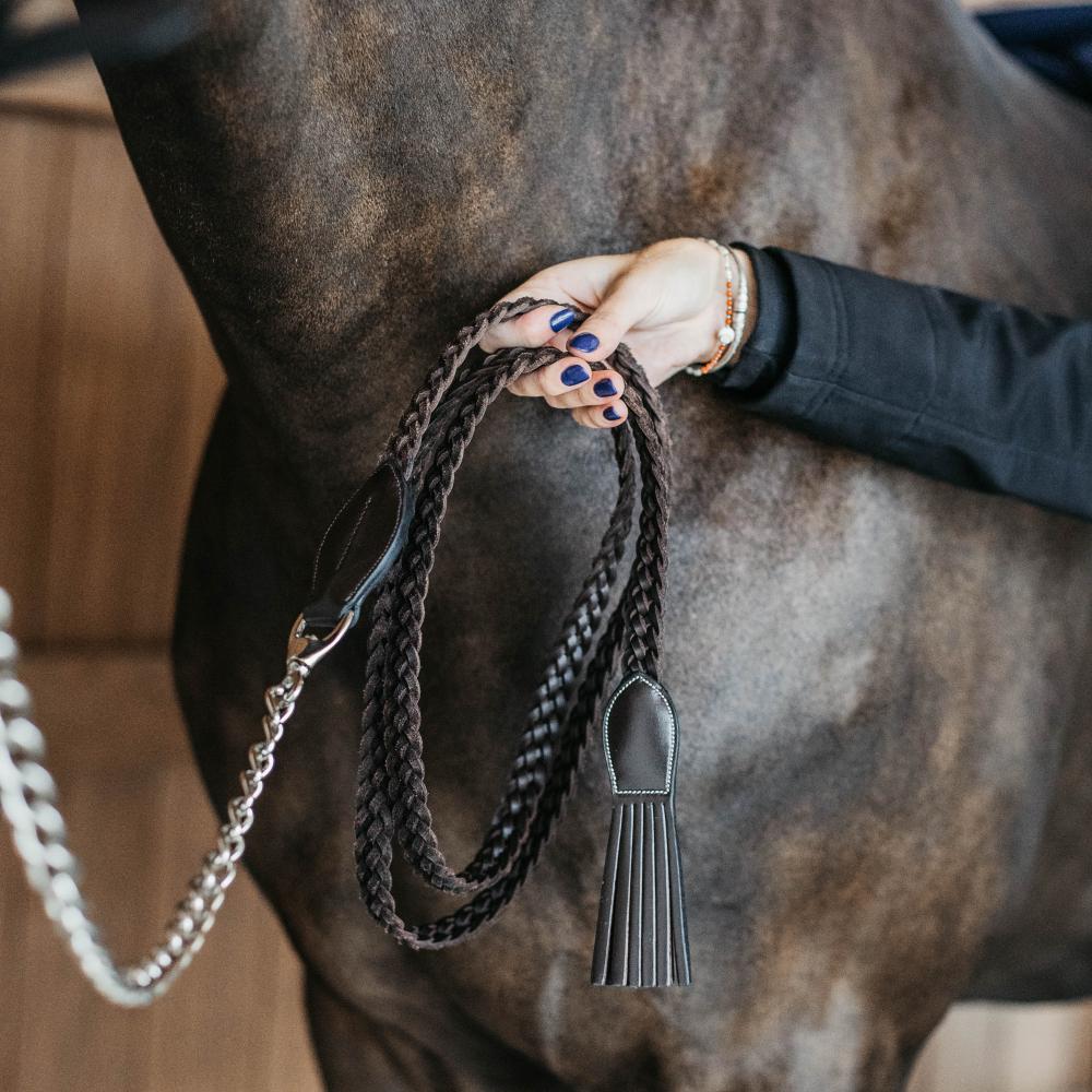 De Gevlochten presentatielijn met ketting is een multifunctioneel halstertouw dat heel stijlvol en elegant is. Het is stijlvol, maar ook sterk en duurzaam. Past perfect bij het gevlochten halster.