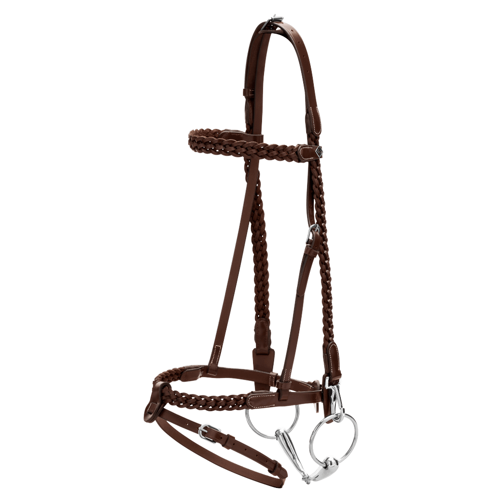 Het hoofdstel heeft een crème stiksel en roestvrijstalen gespen met leren gevlochten details op de neusriem, frontriem en wangstukken. Het is verkrijgbaar in bruin en zwart.