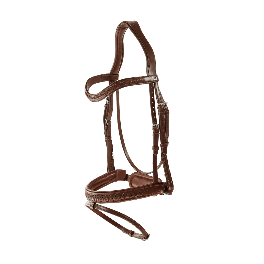 Het hoofdstel maakt deel uit van de New English collectie, wat betekent dat de kleur van de stiksels overeenkomt met de kleur van het hoofdstel. De gespen zijn van roestvrij staal. Er zijn gewoven leren details op neusriem en frontriem. Verkrijgbaar in bruin en zwart.
