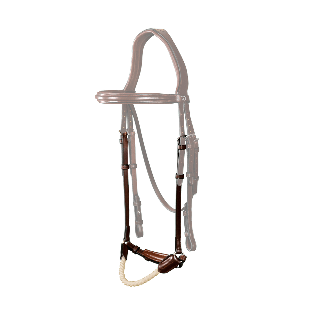 Touw bestaat uit drie in was gedraaide koorden Dit is een trainingsneusriem ontworpen voor korte actie en moet niet strak zitten. Om te controleren of de neusriem goed zit, moet je twee vingers tussen de neusriem en de neus van het paard kunnen steken. Compatibel met de kopstukken van de New English collectie