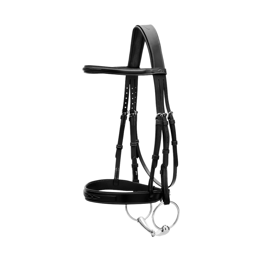 Hunter hoofdstel met Franse neusriem met Dy’on kopstuk met 3 riemen Licht verhoogde vierkante neusriem en frontriem met decoratief stiksel Frontriem zonder vulling met hot stamped logo Brede Franse neusriem