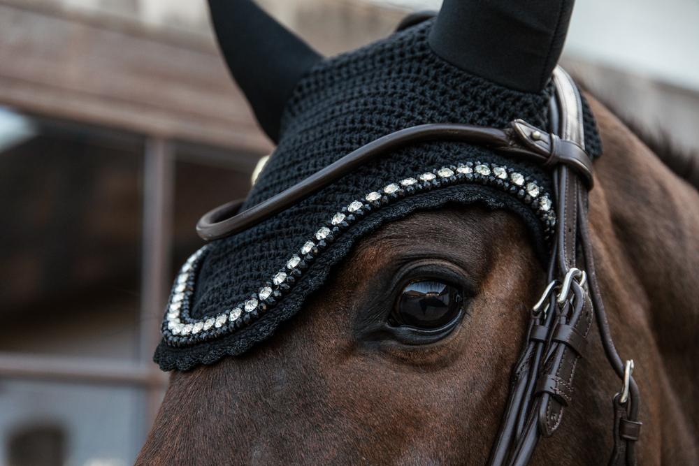 Der Fliegenhaube ist in der beliebten Wellington-Form geschnitten. Das Material der Ohren ist dehnbar und passt sich somit allen Pferden an. Wir haben ein verlängertes Halsteil eingearbeitet, damit die Fliegenhaube nicht unter die Trense rutscht.