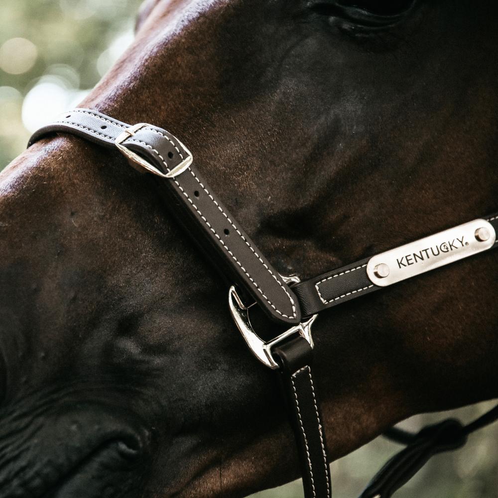 Es hat 2 Schnallen, die am Kopfstück befestigt sind, um das Verstellen der Größe zu erleichtern und das Kopfstück in der Mitte zu halten. Eine extra kleine Schnalle am Nasenriemen macht es auch einfach, eine Trense über das Kopfstück zu ziehen.