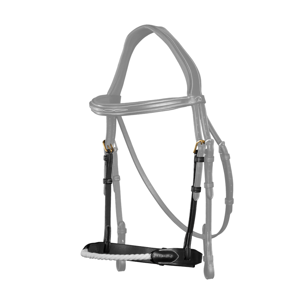 Rope composed of three waxed twisted strands Nar row pull -back closure mounted on a soft padded protective leather backing This is a training noseband designed for brief action and must not be tight. To check that it is fit correctly, you must be able to slip two fingers between the noseband and the horse’s nose Compatible with headpieces of the D Collection