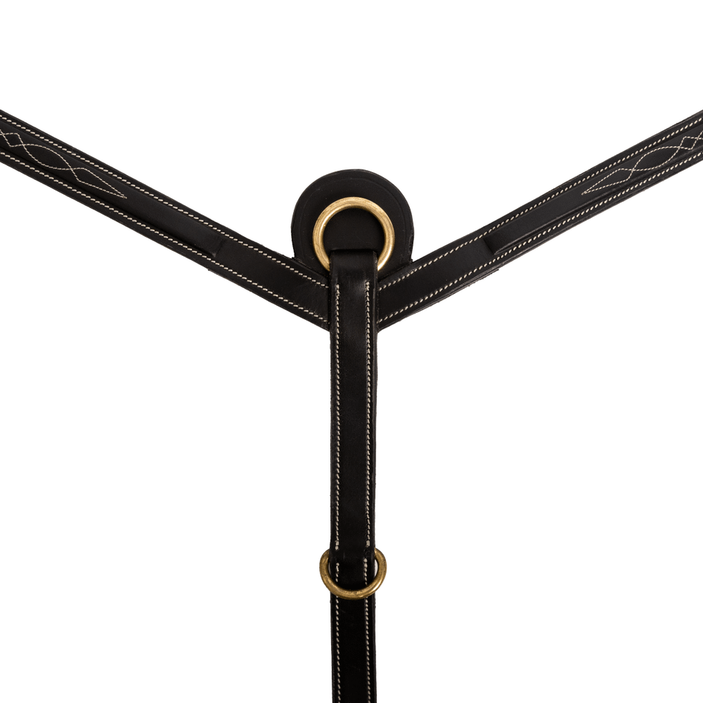 Breastplate in slightly square-raised leather with decorative topstitching Two additional dee rings for attaching draw or side reins 6 cm long elastic bands for comfort Snap hooks for attaching to the saddle