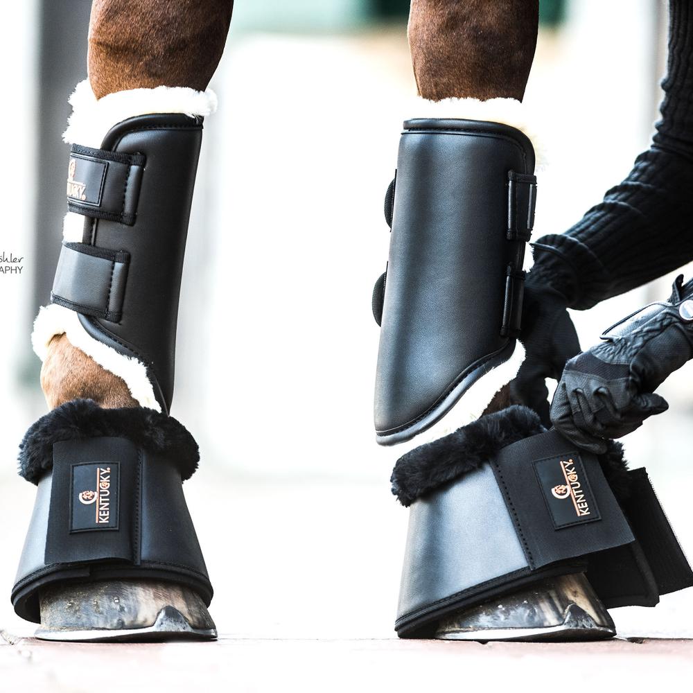 Die Turnout Boots Leather bestehen aus einem strapazierfähigen und vollständig wasserdichten Kunstleder mit einem großzügig gefütterten Inneren aus künstlichem Schaffell und stoßdämpfendem EVA-Kunststoff. Damit bieten diese Turnout Boots Leather eine kostengünstige Lösung für alle Reiter, die hervorragenden Schutz für die Beine im Alltag zu einem erschwinglichen Preis suchen. Durch die anatomische Passform und den belastbaren und sicheren Klettverschlüssen bieten diese Gamaschen 100% Komfort auch für Pferde mit empfindlicher Haut und sind gleichzeitig pflegeleicht. Das macht sie zur idealen Wahl für Reiten in allen Disziplinen und Leistungsklassen. Diese Gamaschen kann man nutzen für Training, Führen an der Hand, Führmaschine, Longieren, etc. Ideal für alle Pferde. Bestehend aus Kunstleder und künstlichem Schaffell sind diese Gamaschen 100% tierfreundlich und dabei leicht zu pflegen, da sie in der Waschmaschine bei 30 ° C gewaschen werden können (kein Trockner). Kentucky Horsewear hat ein eigenes Pflegeprodukt entwickelt, um unser Kunstleder zu reinigen. Sehr einfach und effizient.