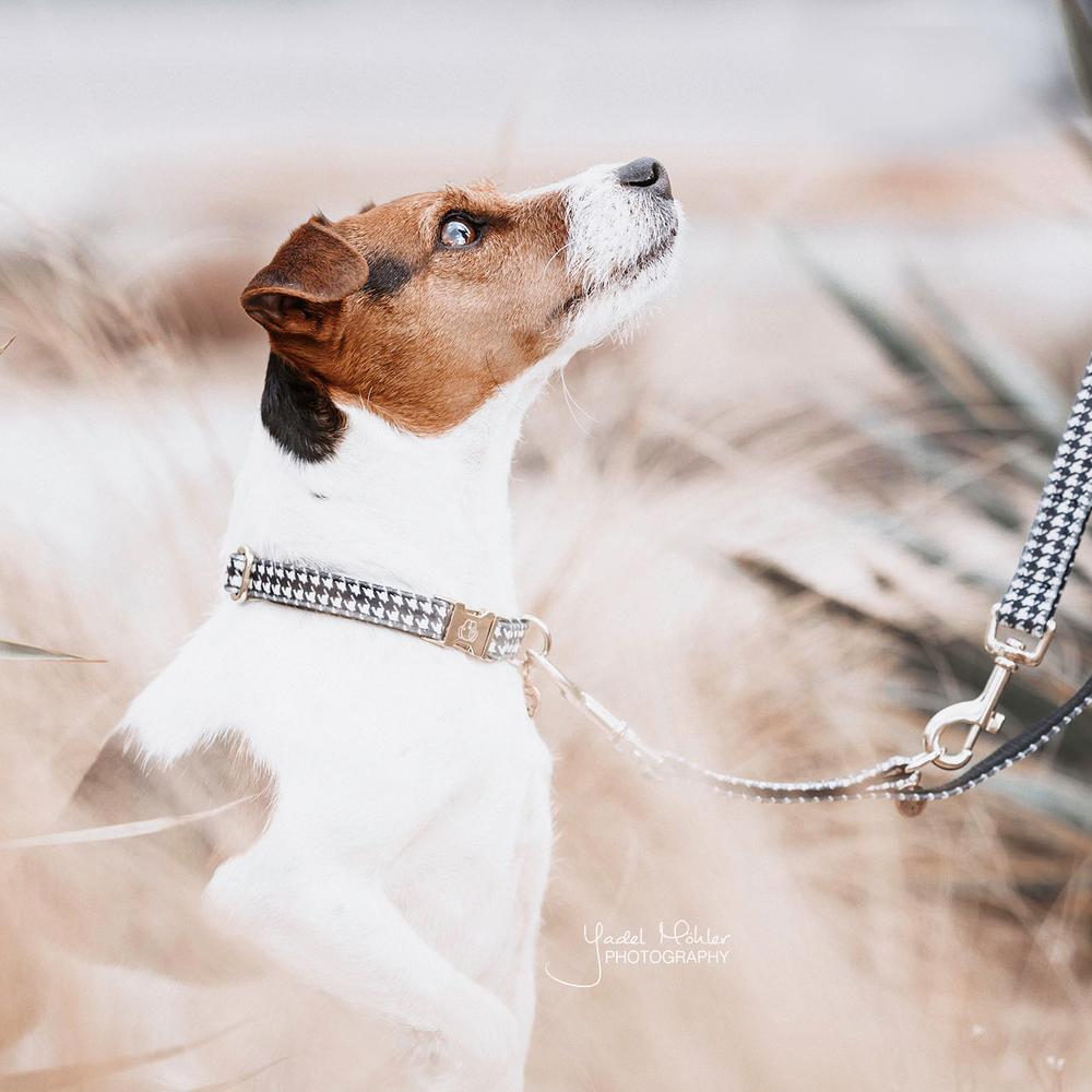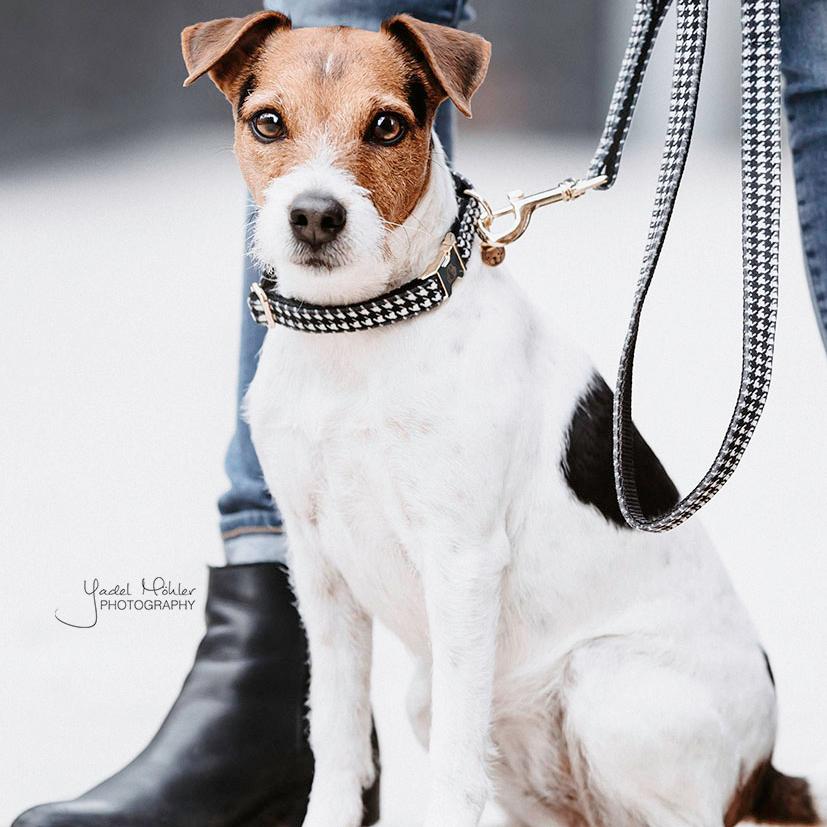 Plastisch und schick zugleich, passt das Pied-de-Poule-Muster perfekt zu unseren Hundehalsbändern.