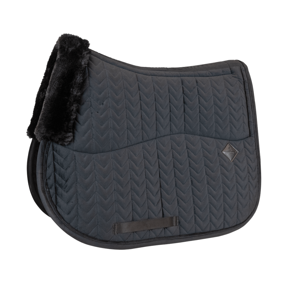 Die hautfreundliche Samtschabracke ist in den Formen Springen und Dressur erhältlich. Es einen Gurtbandriemen, so dass keine störenden Riemen vor dem Sattel zu sehen sind. Das Kentucky-Logo ist etwas höher platziert, so dass noch Platz für eine Stickerei mit deinem eigenen Logo ist.