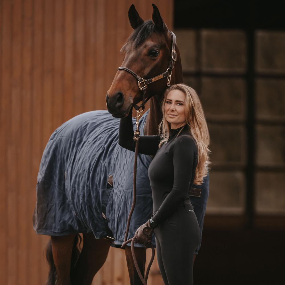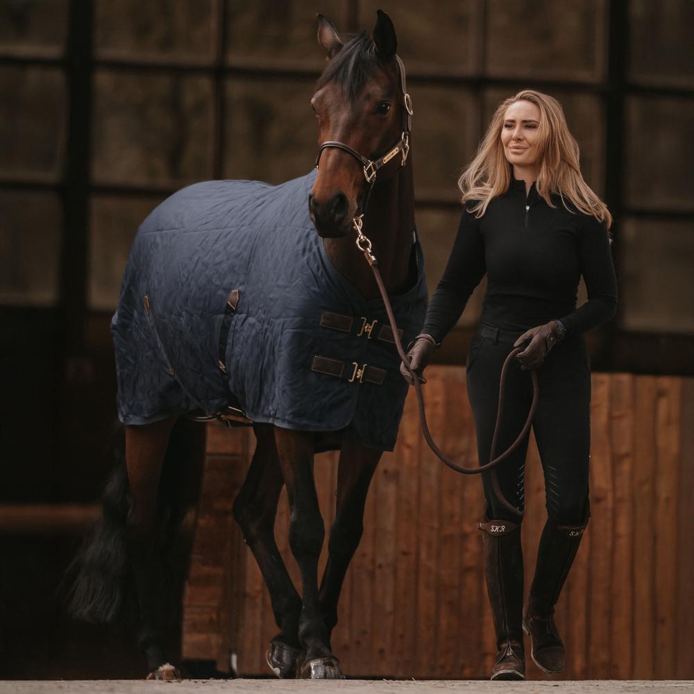 Das quadratisch gesteppte Obermaterial aus 600D Polyester ist sehr reißfest. Die Decke hat keine Füllung. Das künstliche Kaninchenfell erzeugt jedoch winzige Lufteinschlüsse, die die Körperwärme des Pferdes einfangen und zurückhalten. Dank des Futters aus künstlichem Kaninchenfell verrutscht die Decke beim Wälzen nicht. Das künstliche Kaninchenfell verhindert auch Scheuern und verleiht dem Pferd ein glänzendes Fell.