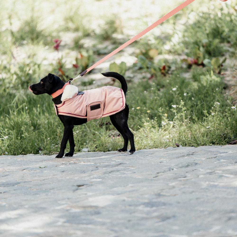 Das wasserdichte Außenmaterial des Hundemantels besteht aus strapazierfähigem 10 000 mm (ISO-Standard) wasserdichtem Polyester mit atmungsaktiver Membran. Dadurch kann Ihr Hund den ganzen Tag im Regen laufen, ohne nass zu werden. Die Paspeln und das Logo an der Seite reflektieren, damit Ihr Hund im Dunkeln sichtbar ist. Um Ihren Hund vor Kälte zu schützen, hat der Hundemantel eine 160g-Füllung und ein Futter aus künstlichem Kaninchenfell. Dieses erzeugt winzige Lufteinschlüsse, die die Körperwärme des Hundes einfangen und speichern, und bringt das Fell des Hundes auch zum Glänzen. Eine gibt auch eine kleine Kapuze aus künstlichem Schaffell, die für zusätzlichen Schutz über den Hals geklappt werden kann. Unter der Kapuze befindet sich eine Kunstlederklappe, unter der sich wiederum sich ein kleines Loch für eine Leine befindet.