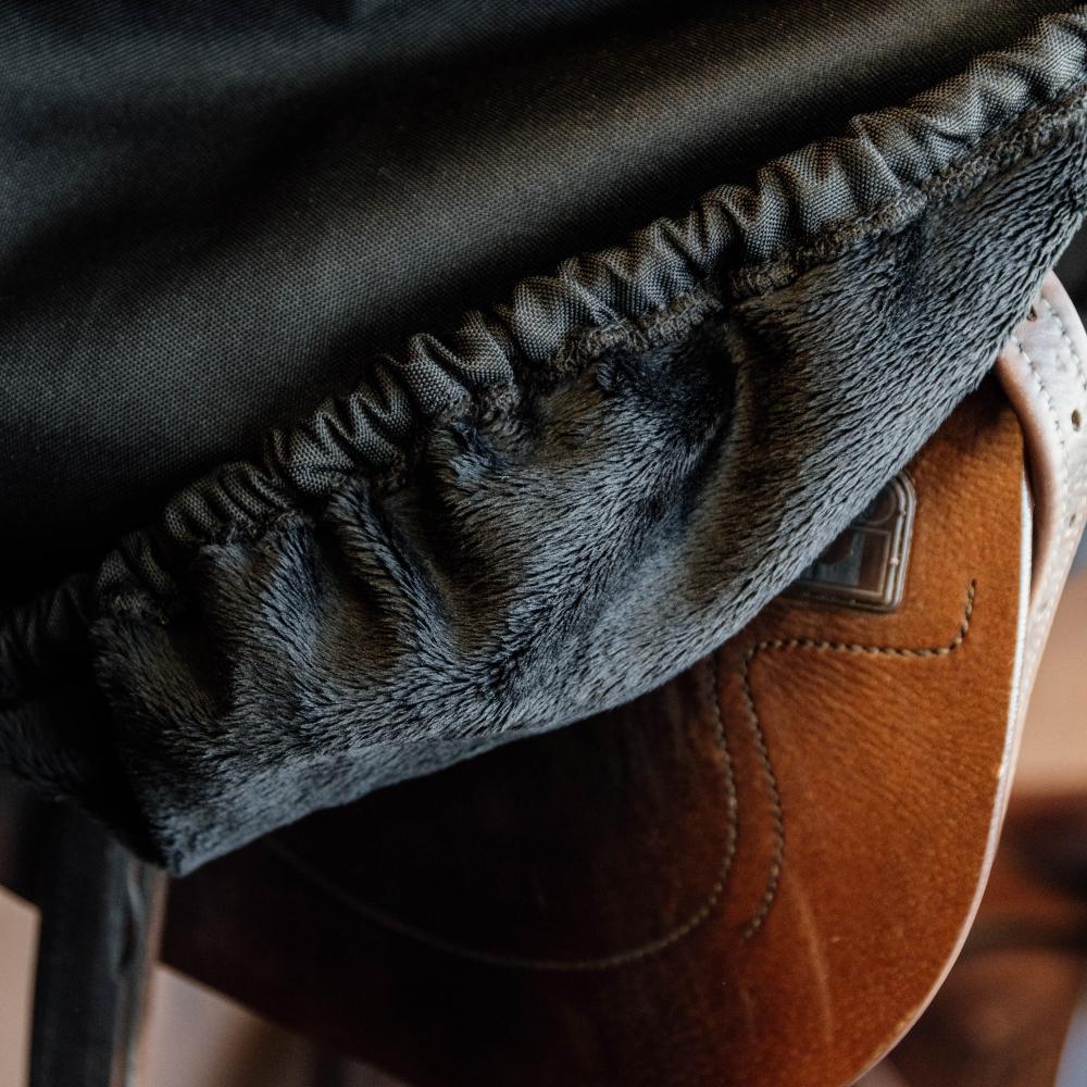 Die Außenseite besteht aus einem starken, wasserabweisenden Stoff. Die Innenseite ist mit künstlichem Kaninchenfell bezogen. Dieser Stoff wird auch als Innenfutter bei unseren Pferdedecken verwendet. Künstliches Kaninchenfell ist extrem weich, so ist Ihr Sattel bestens vor Kratzern geschützt.