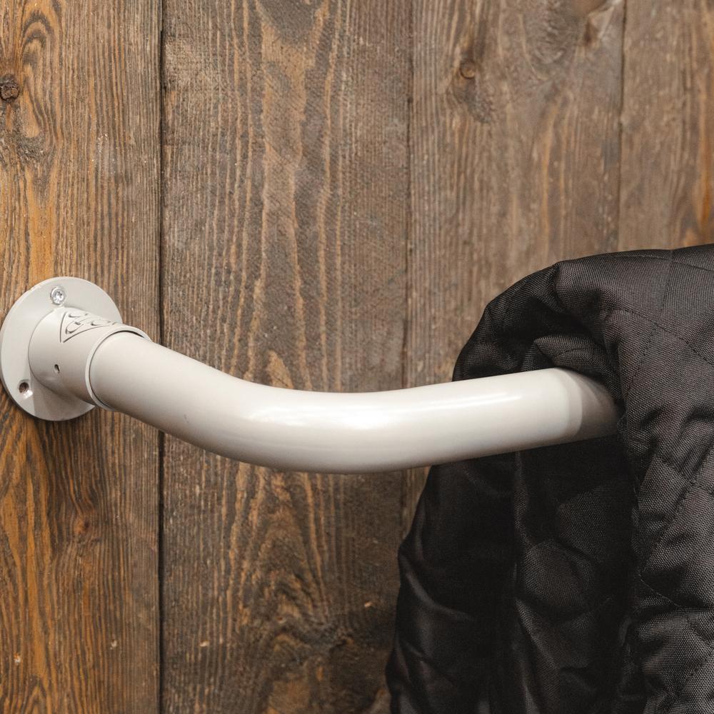 Der Halter ist so gestaltet, dass er mehrere Decken oder Tücher aufnehmen kann und bietet genug Breite zum Stapeln. Zusammengeklappt nimmt er nur minimalen Platz ein und ist ideal für die Aufbewahrung in belebten Stallumgebungen. Erhältlich in schwarz, silber und gold.