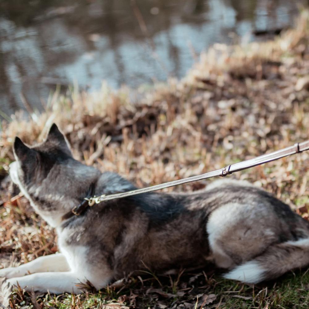 Dog leash in flat Dy’on leather Maximum 180 cm, minimum 90 cm. Width: 1.6 cm Adjustable by means of 1 brass stud and four holes Cream stitching, brass snap hook