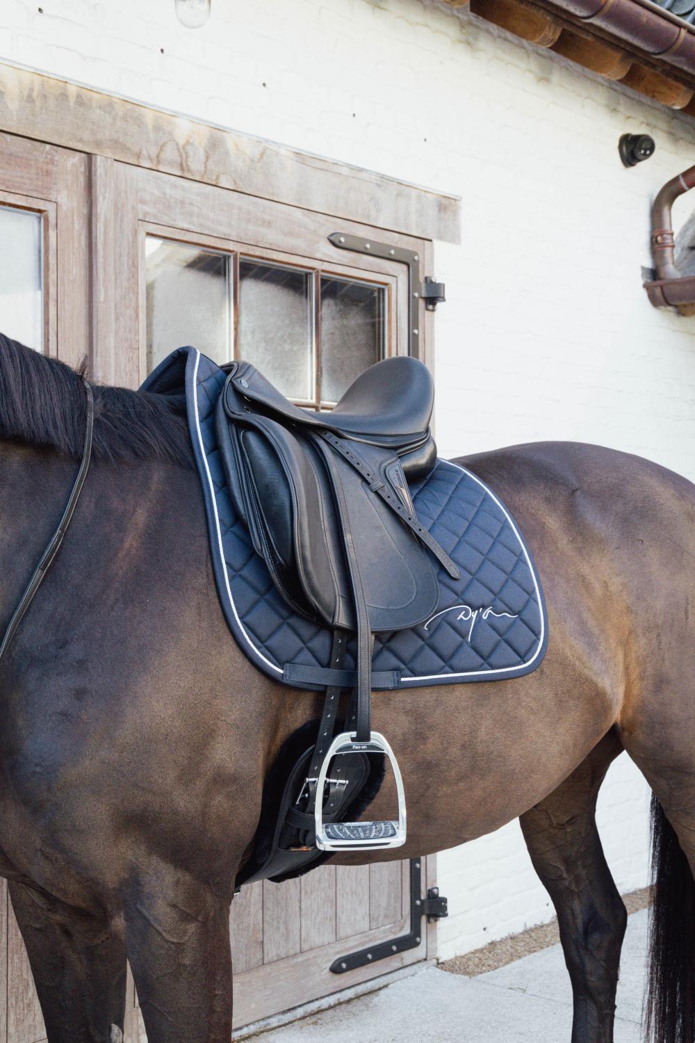 Die Schabracke hat keine störenden Riemen, sondern nur einen Nylonriemen für den Sattelgurt. Das Dy'on-Logo auf beiden Seiten der Schabracke lässt Platz, damit du sie auch mit deinem eigenen Logo besticken kannst.